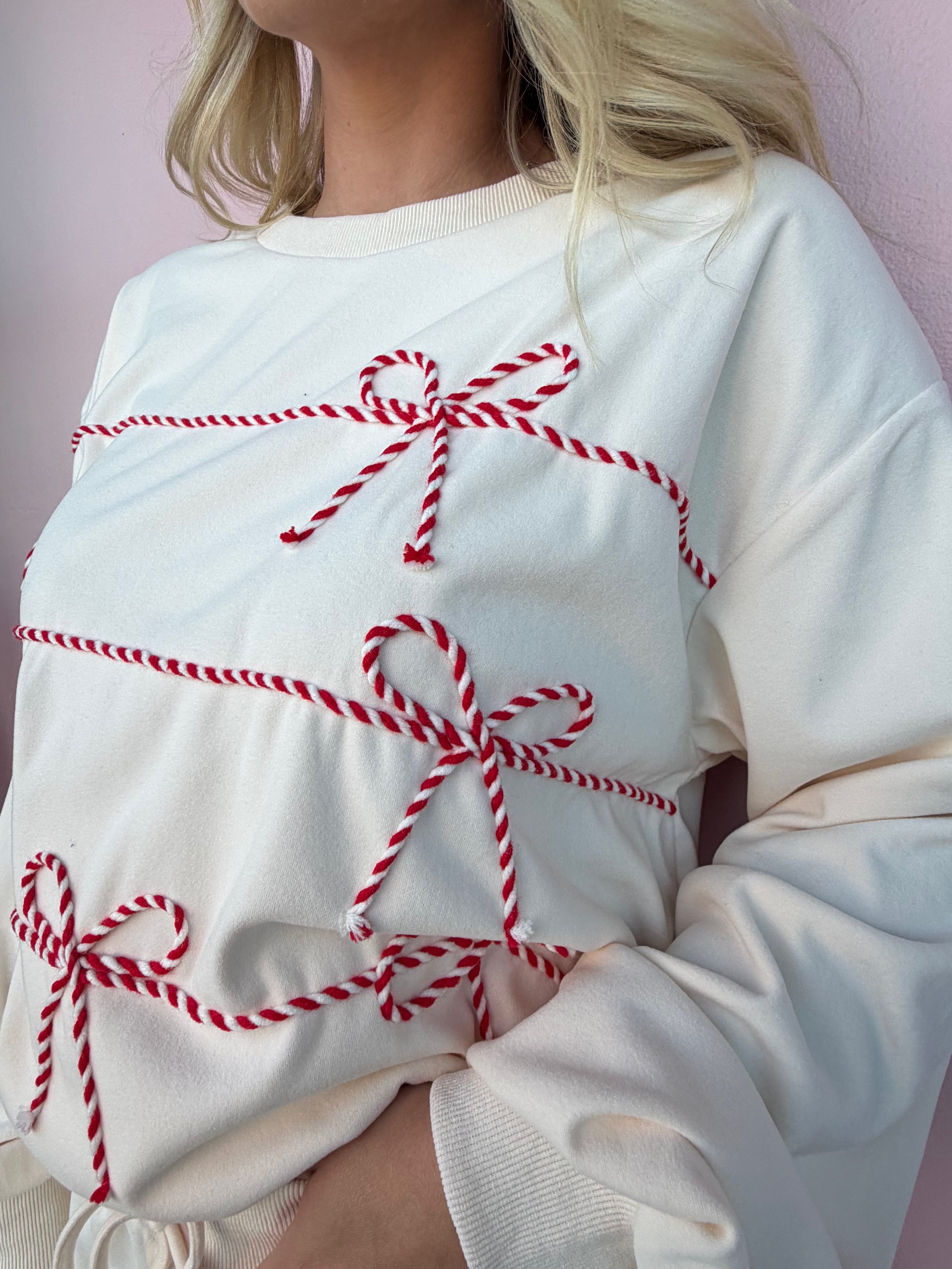 Wrap yourself in festive comfort with the Candy Cane Cozy Sweatshirt! This ultra-plush cream pullover features a playful twist bow cord detail in classic red and white for the ultimate holiday touch. Designed for lounging in style or running festive errands, this cozy sweatshirt pairs perfectly with the matching sweatpants (sold separately) for a head-to-toe Christmas look you’ll love.
