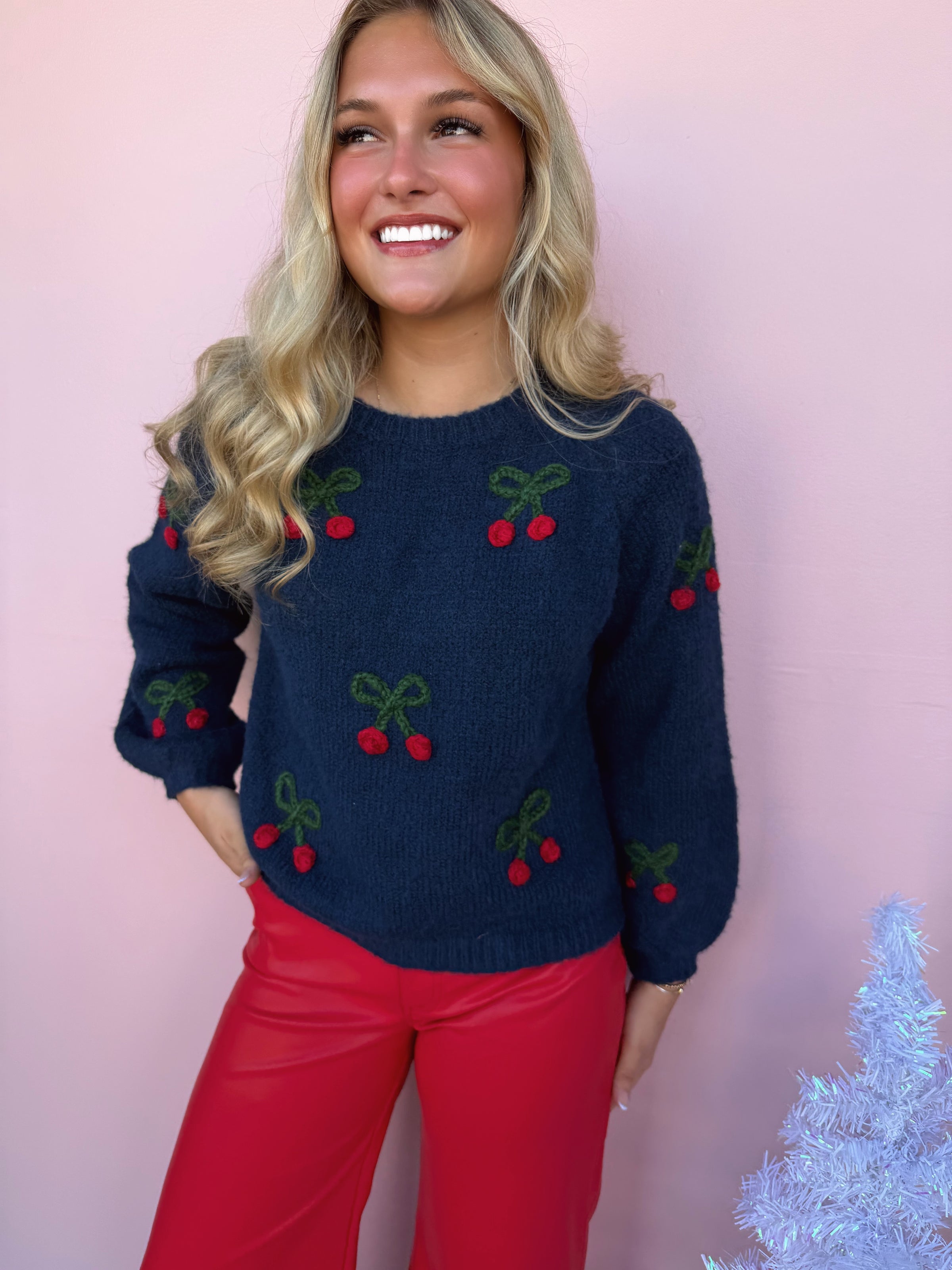 π Festive Design: Navy knit sweater adorned with red cherry embroidery and green bow accents for a whimsical, holiday-ready look.