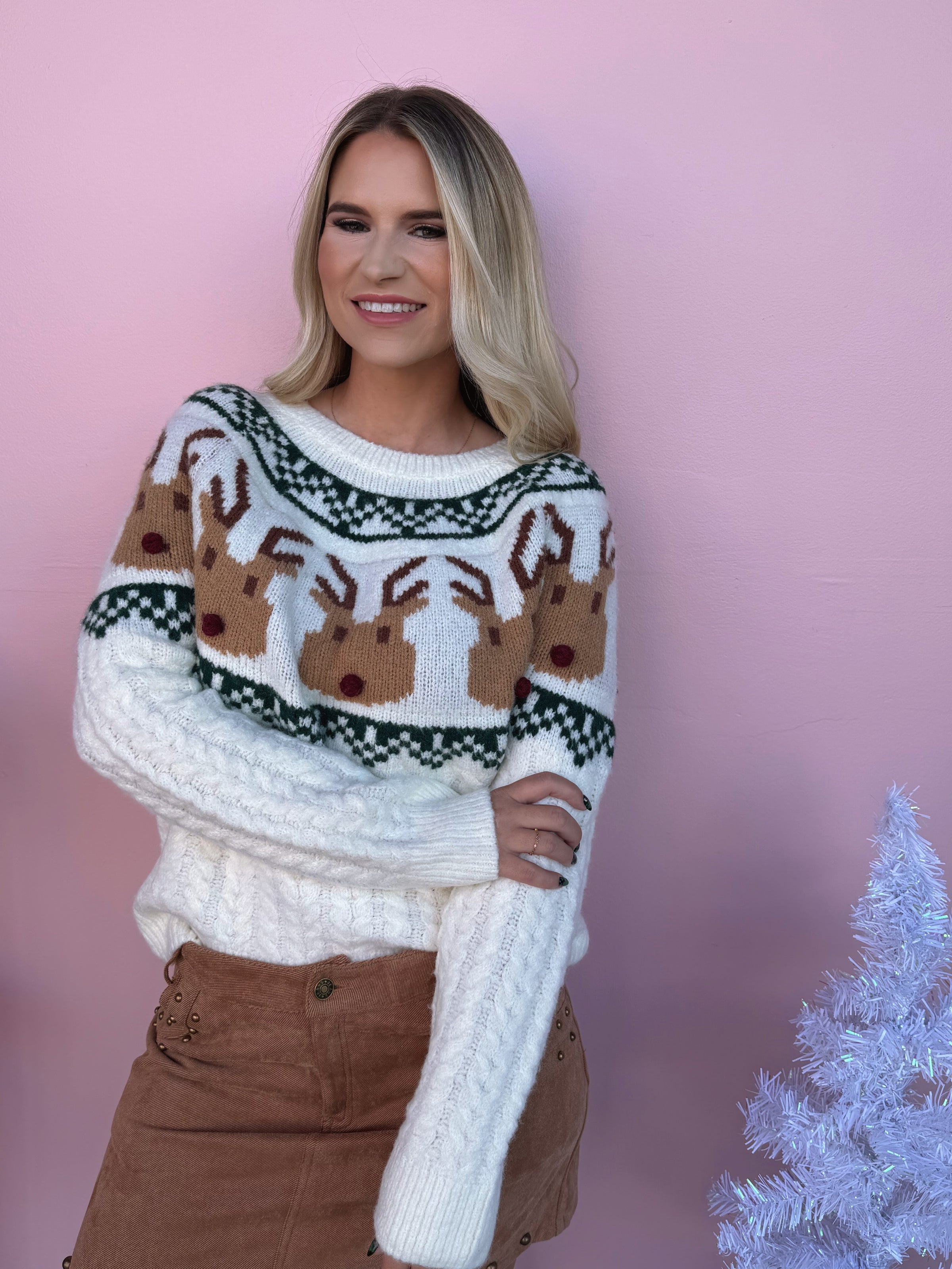 This ivory Rudolph sweater brings a touch of nostalgia and joy to your winter wardrobe — a must-have for anyone who loves fun, festive knitwear.