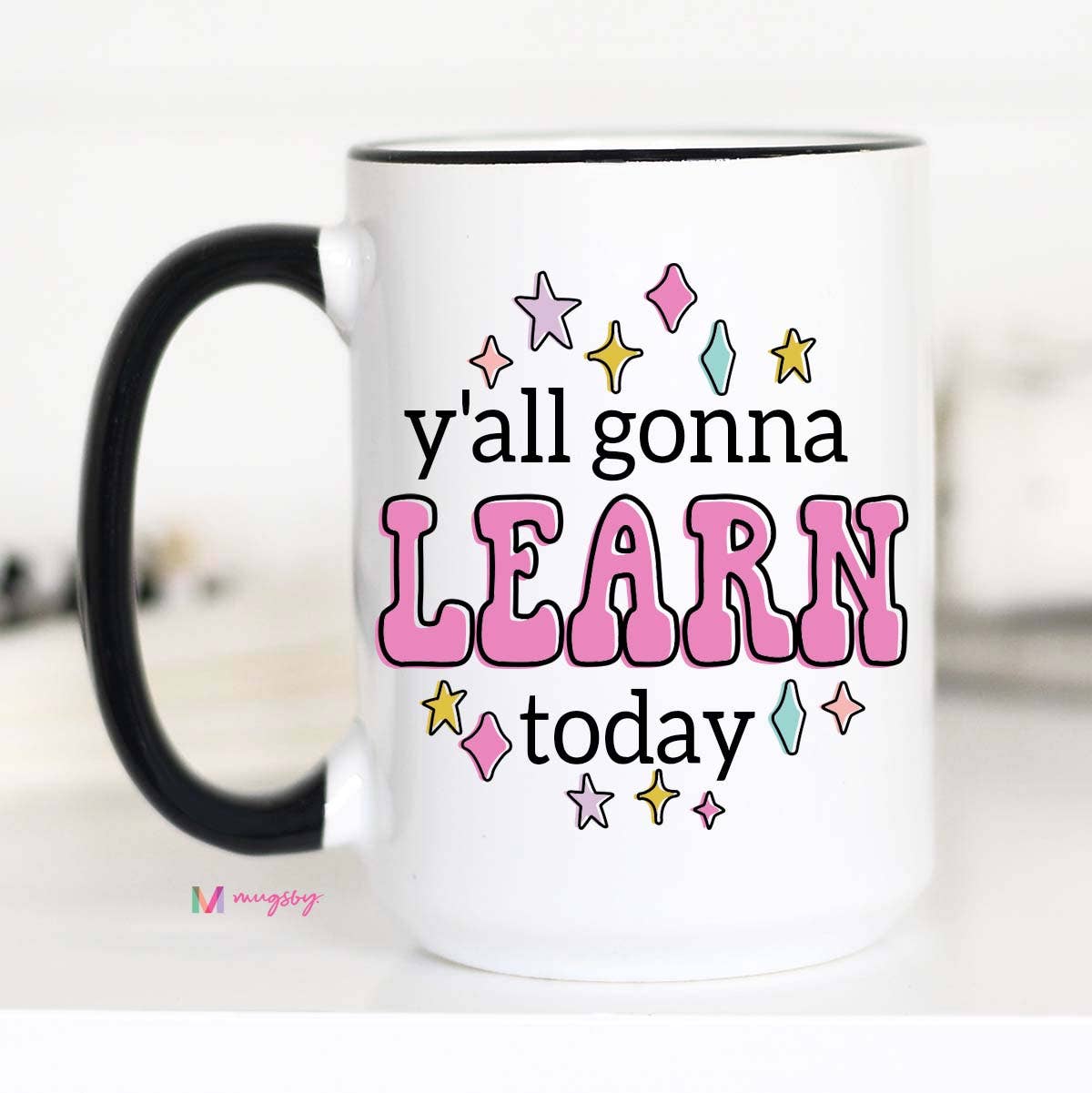 Double sided print. Top rack dishwasher safe. Microwave safe.. Off white with a black rim and handle. Made of ceramic.