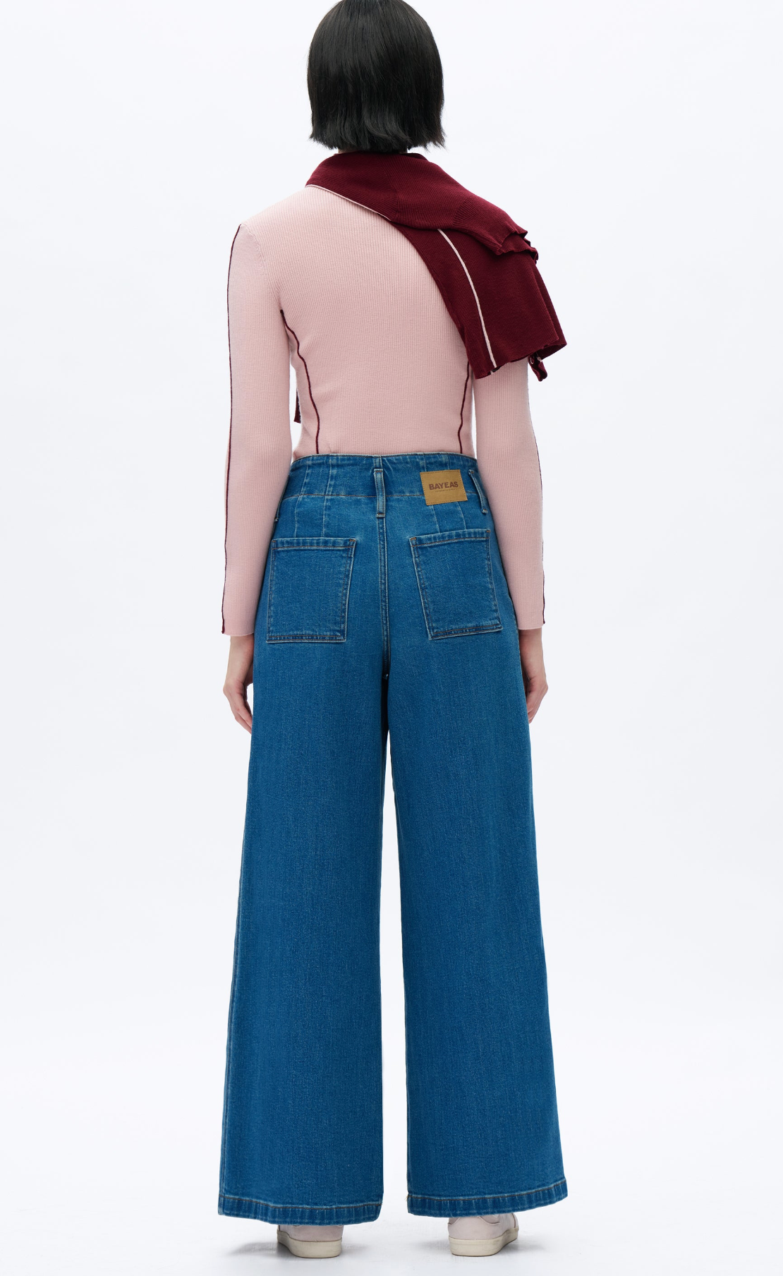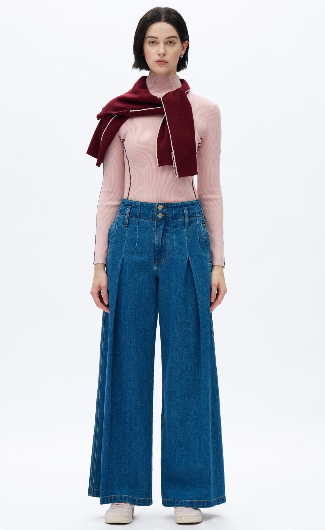 Statement denim at its finest. These wide-leg trousers feature dramatic front pleats, a structured high-rise waist, and double button closure for a chic, tailored look. The flowy silhouette gives designer vibes while still being totally wearable for everyday errands or dressed-up nights out. A must-have if you love elevated basics.