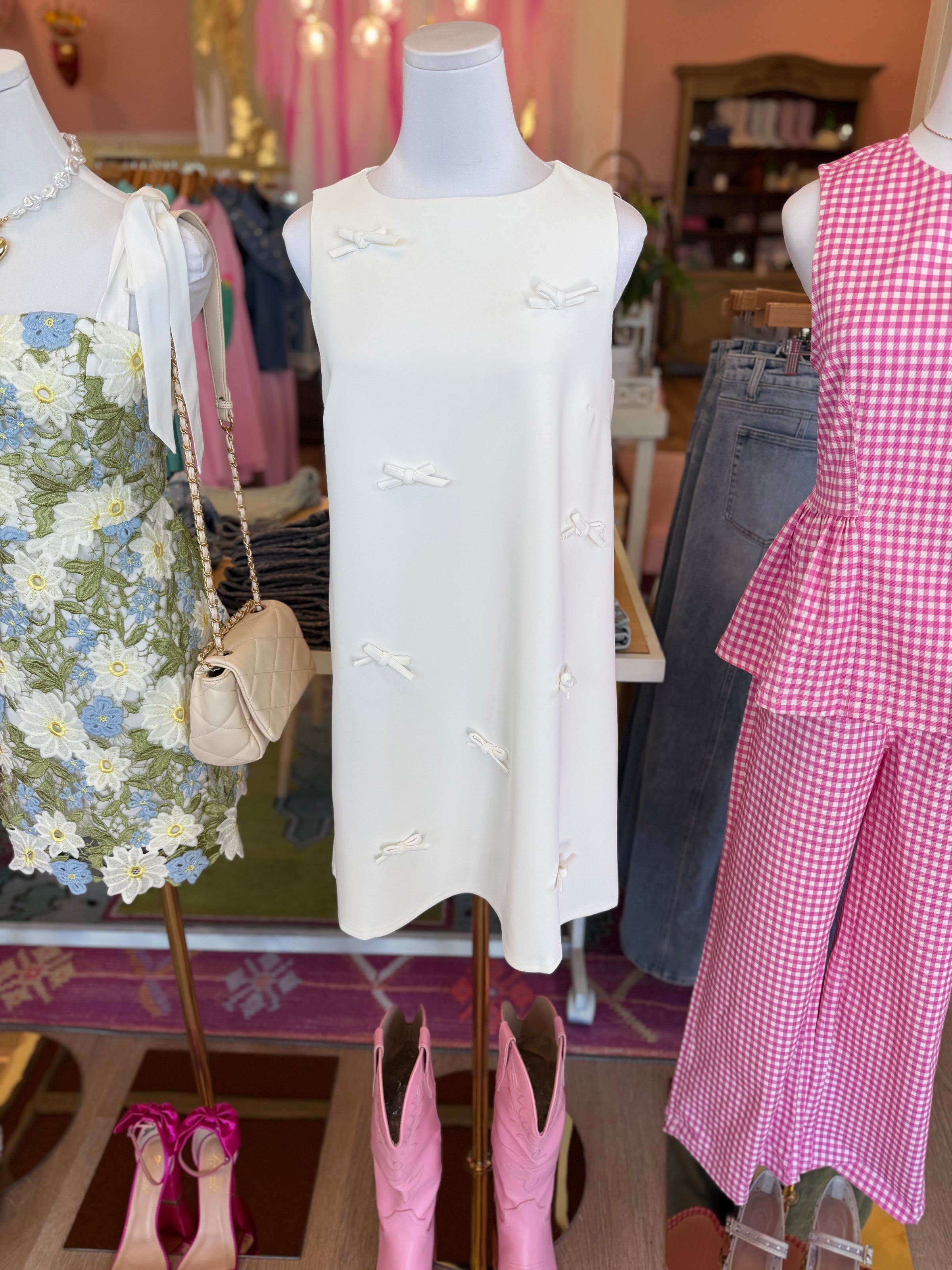 Simple, chic, and sprinkled with the sweetest details — the Little Bow Moment Dress is the kind of piece that makes getting dressed feel effortless. This sleeveless ivory shift features delicate mini bow appliqués scattered throughout, adding just the right touch of feminine charm. The relaxed silhouette drapes beautifully for an easy, flattering fit that works for everything from brunch with the girls to baby showers or spring events.