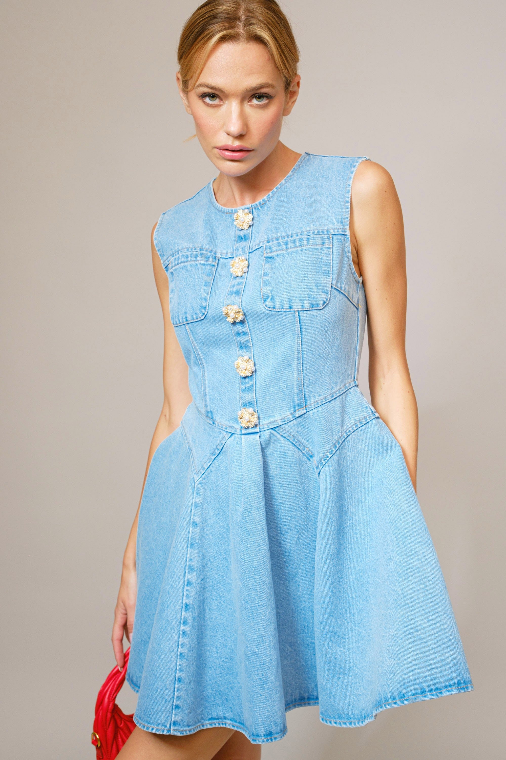 Polished, poised, and ready for wherever the invite leads. The Socialite in Chambray Mini features a soft light-wash denim with a tailored bodice and a flattering fit-and-flare silhouette that defines the waist beautifully. The standout floral statement buttons down the front add a luxe, vintage-inspired touch that feels effortlessly elevated.