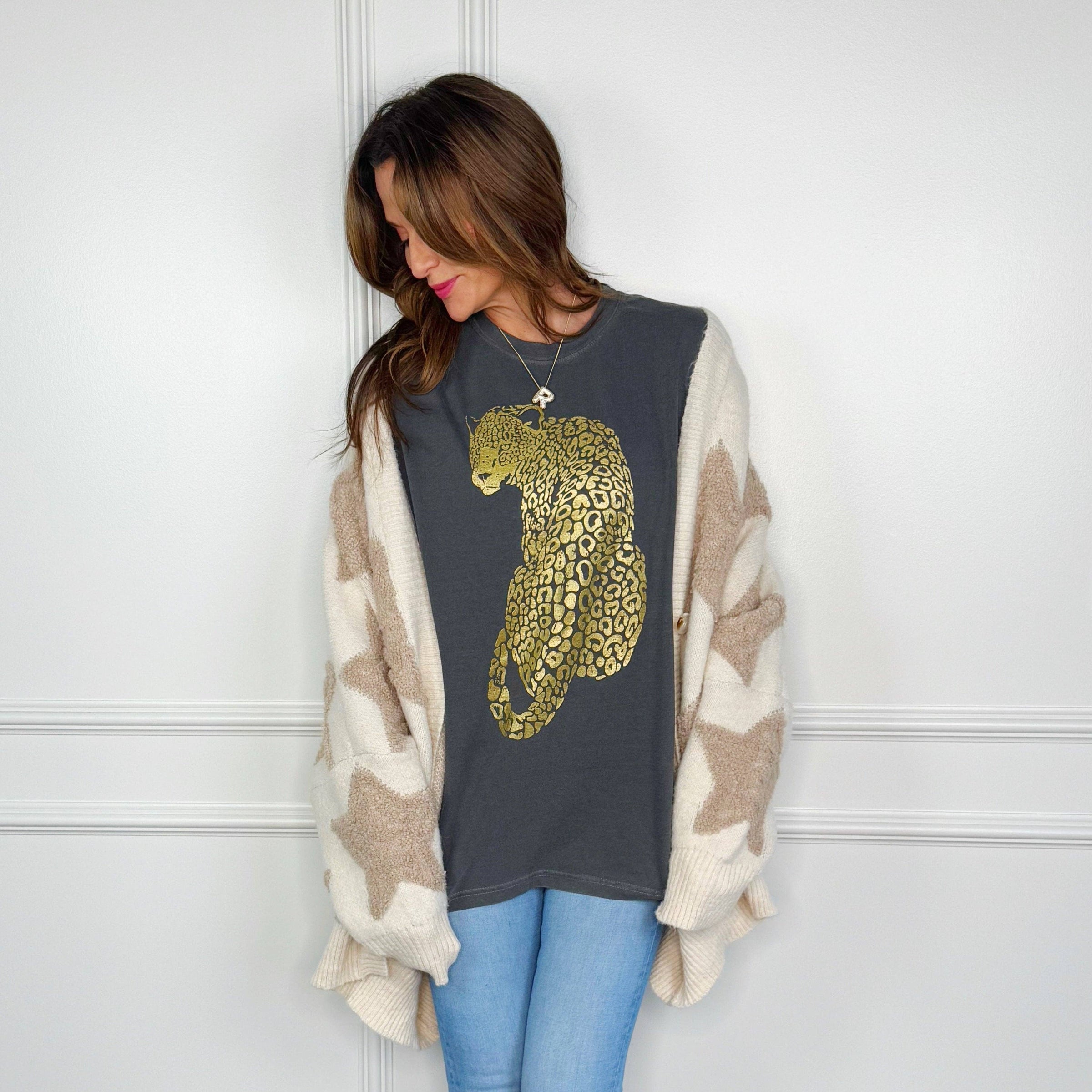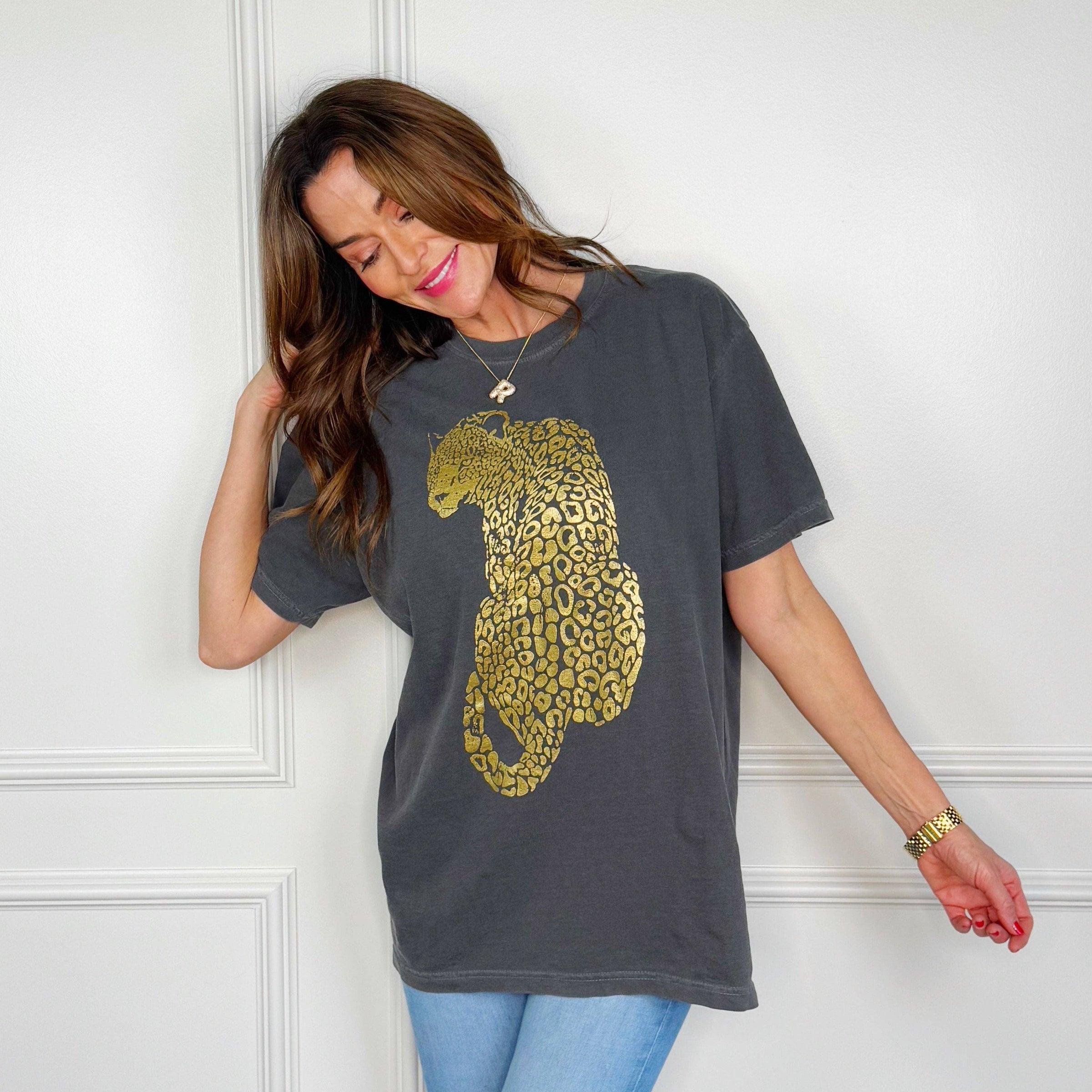 Unleash your wild side with our Shimmer Leopard Tee! The perfect blend of bold and sparkle, this tee will have you standing out in the crowd. Embrace your inner feline and add a touch of shimmer to any outfit.