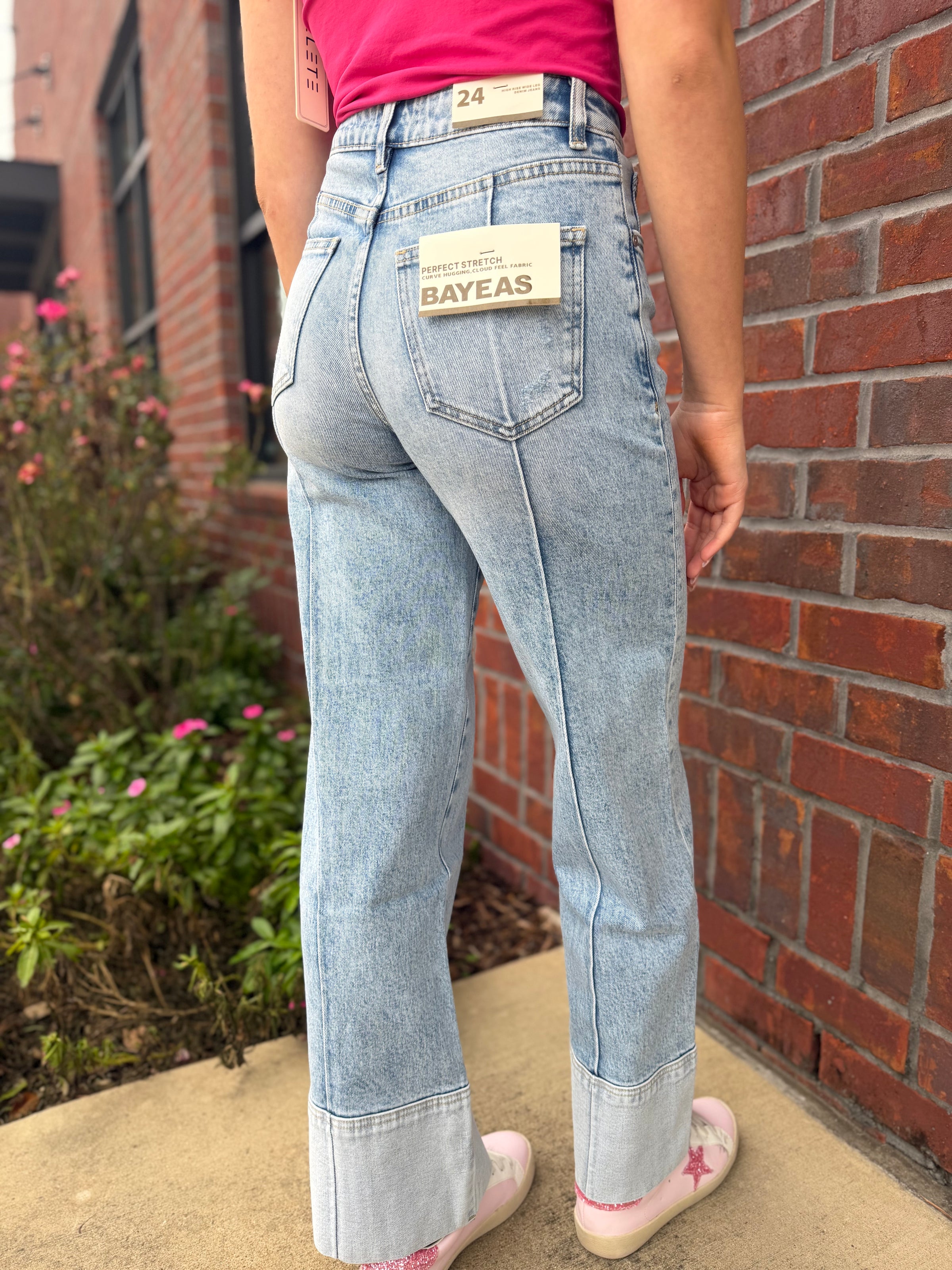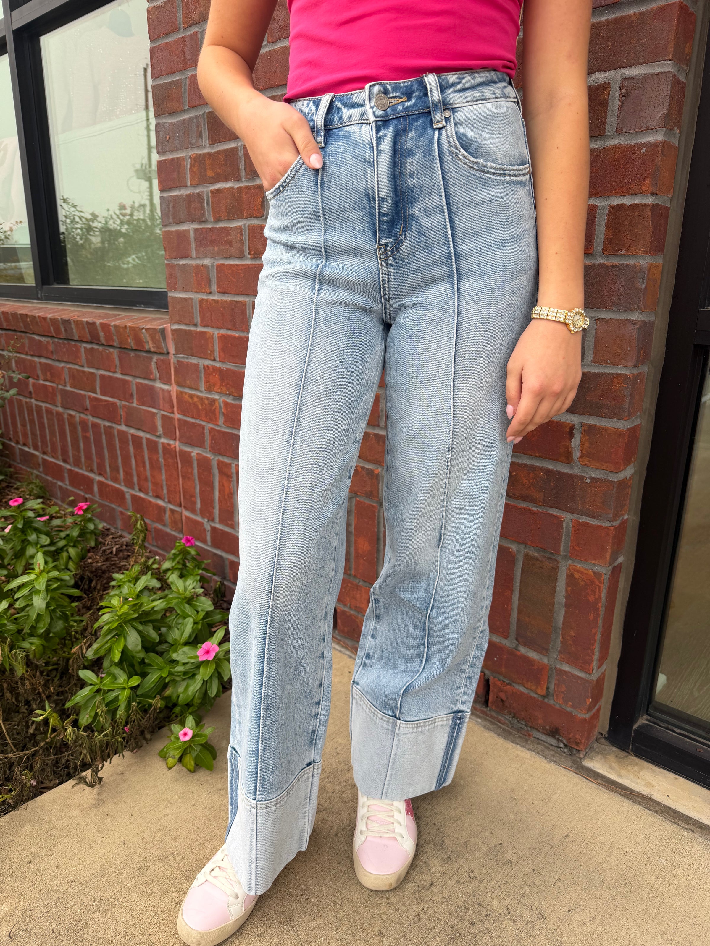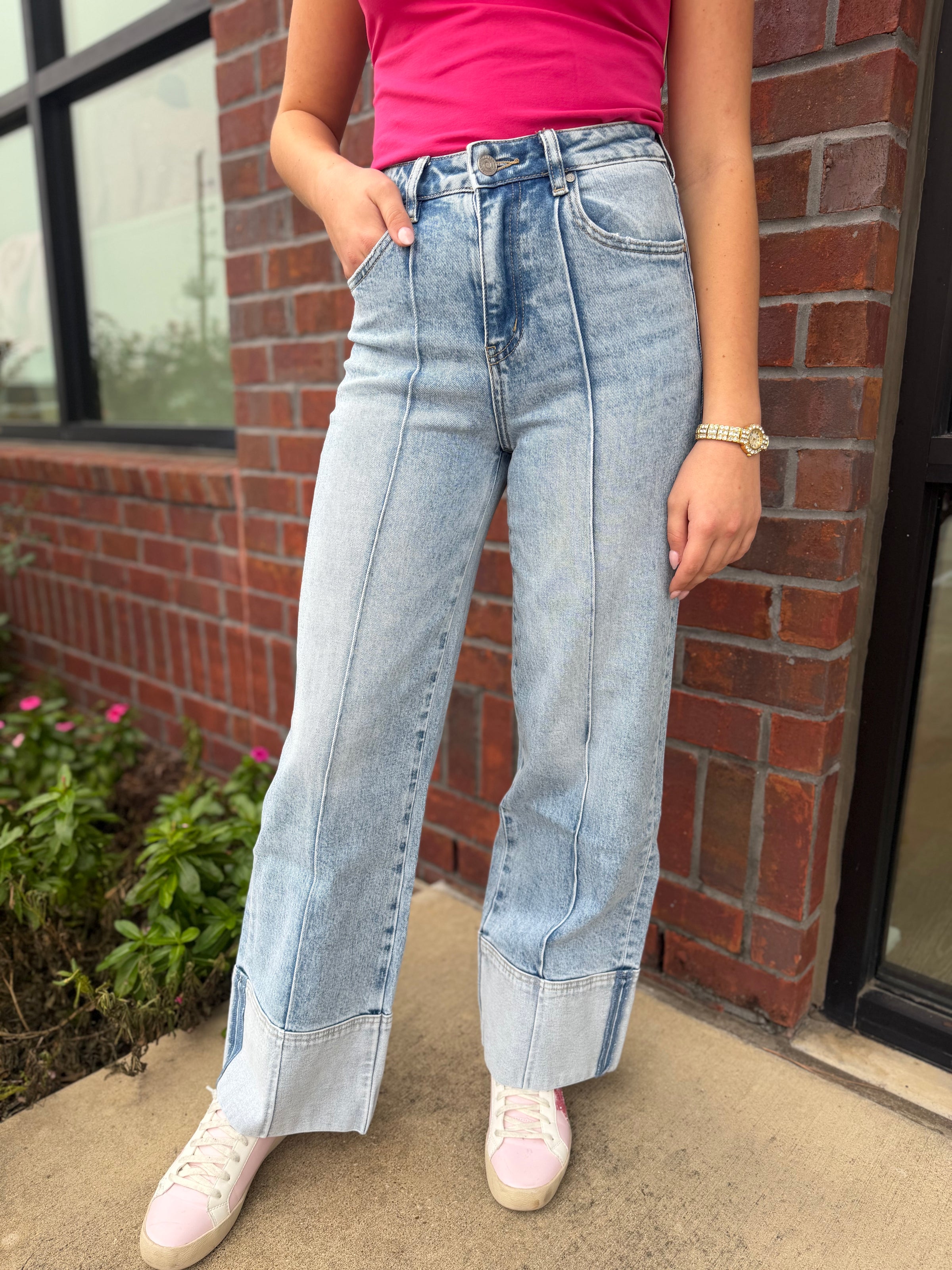 Meet the jeans that do the shaping for you. The Felicity Seam Jeans feature a flattering high-rise fit with vertical seam detailing that elongates the leg and gives that tailored, elevated look. Finished with a subtle wide cuff hem and a soft vintage wash, these jeans are the perfect blend of classic denim and modern boutique style.