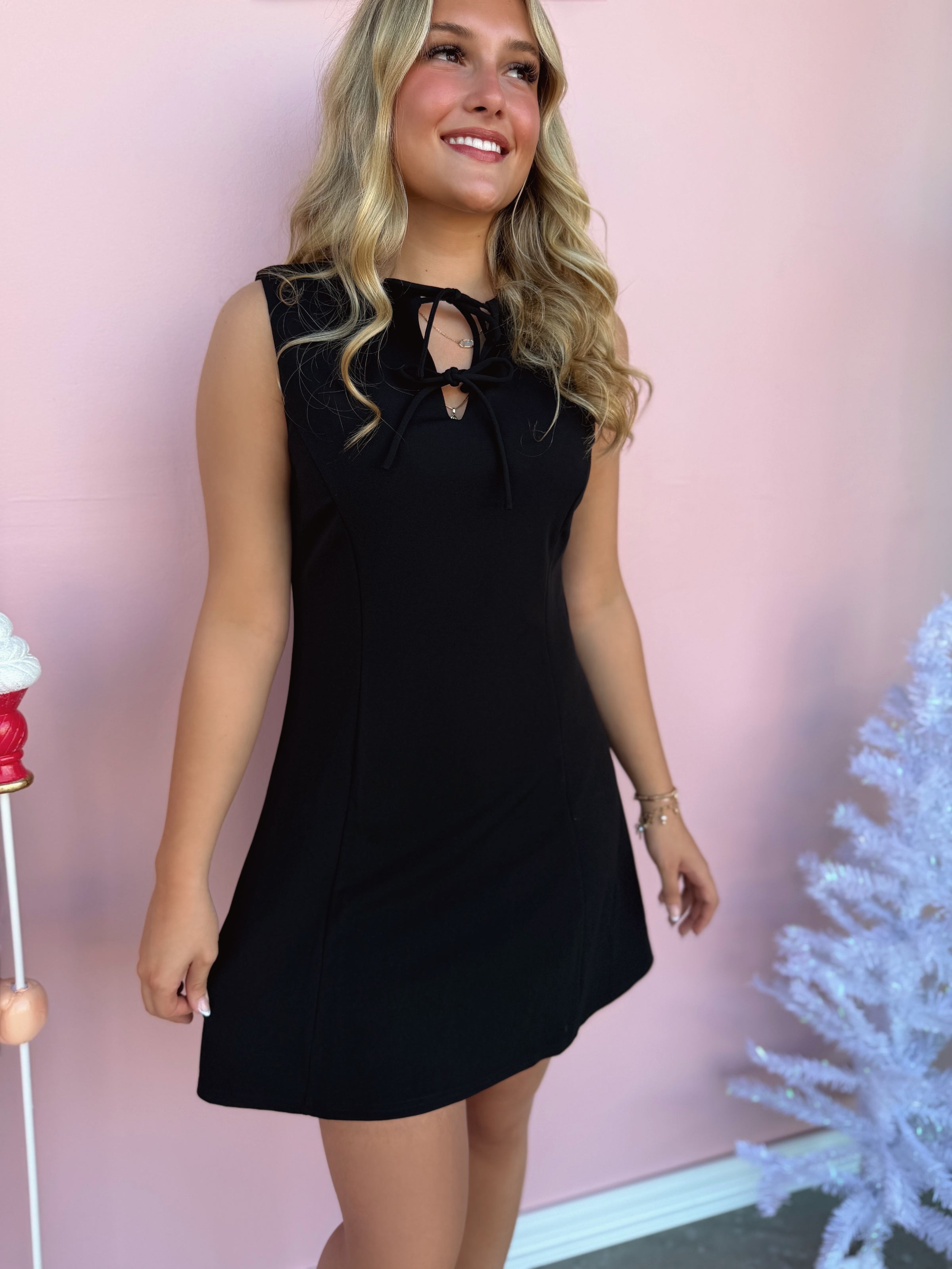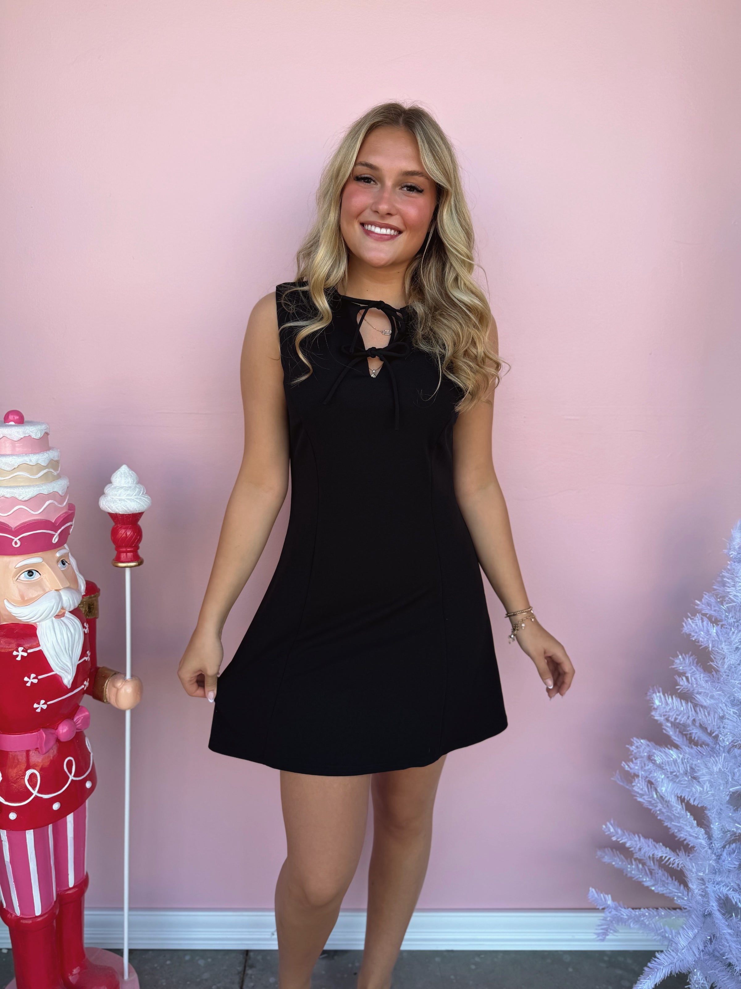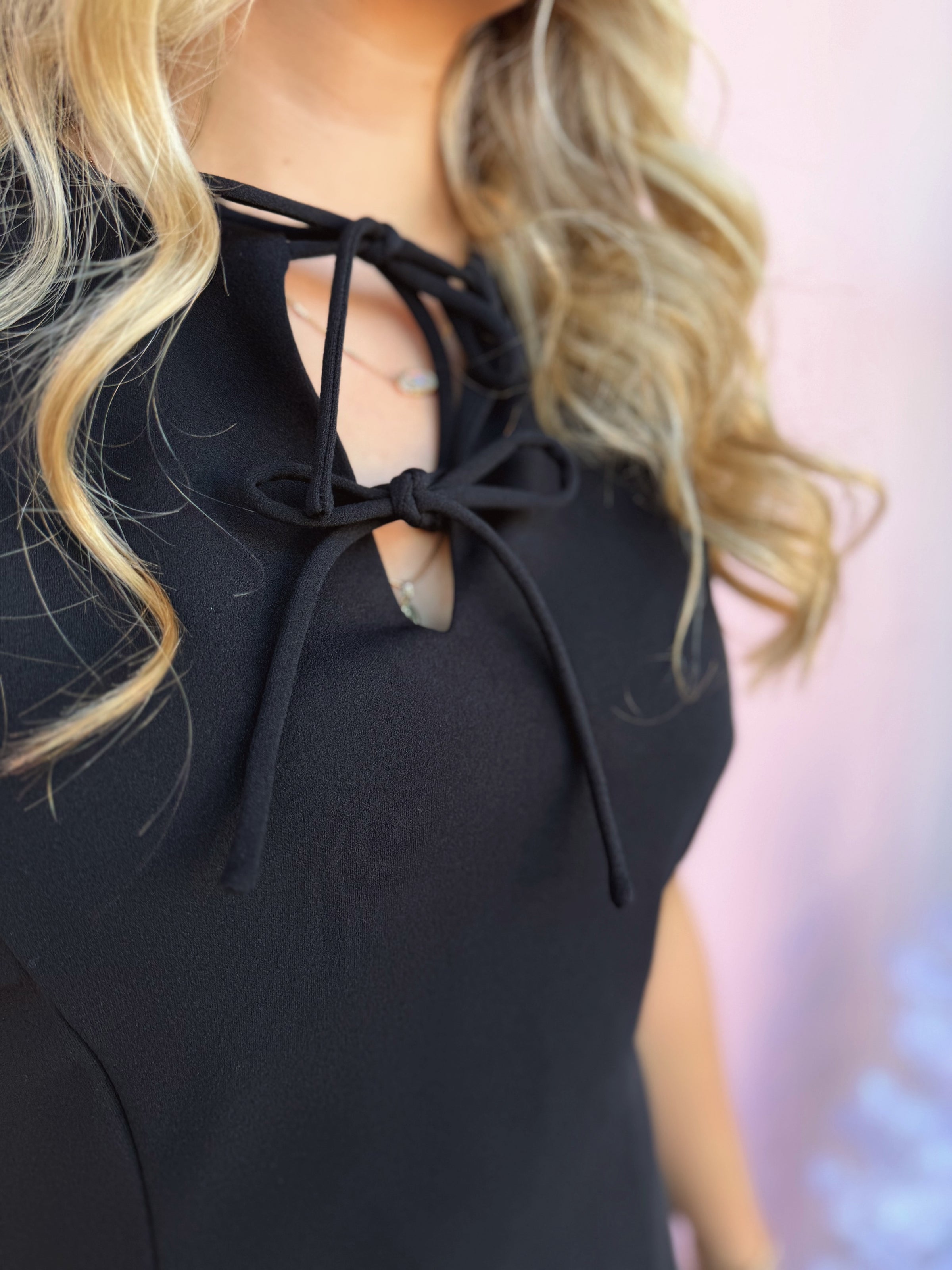 Classic with a subtle twist, the Noire Muse Bow-Front Dress is your go-to when you want to look put-together without trying too hard. Designed with a flattering A-line silhouette, this sleeveless mini skims the body just right, while the delicate bow-tie detail and keyhole neckline add a feminine, elevated touch. It’s the kind of dress that works for dinners, date nights, showers, or any moment you want simple sophistication with a little personality.