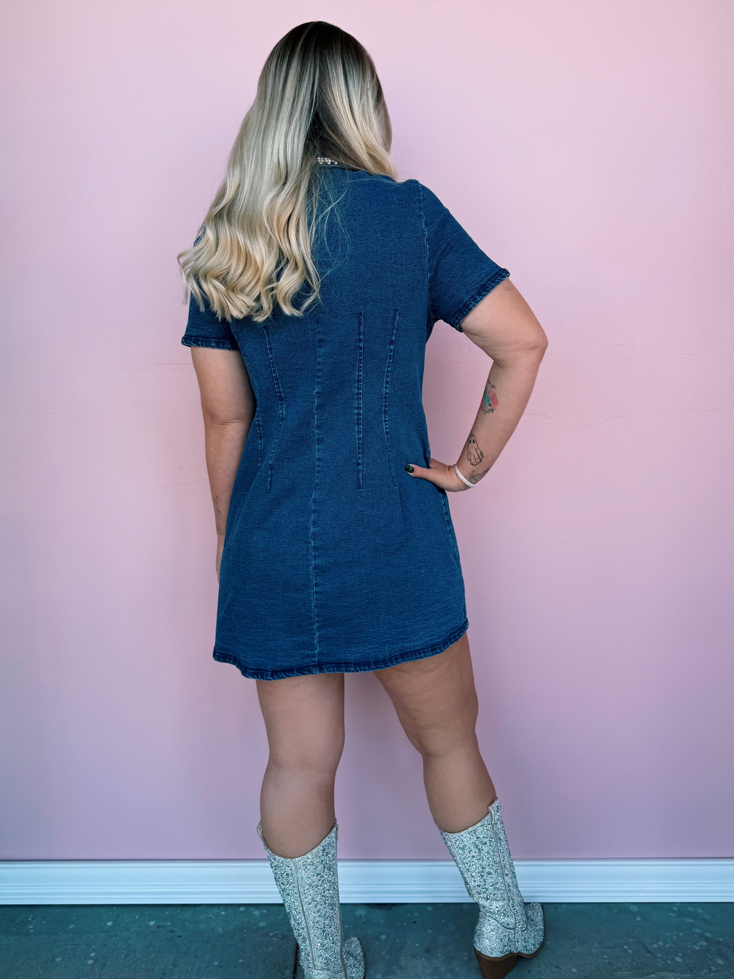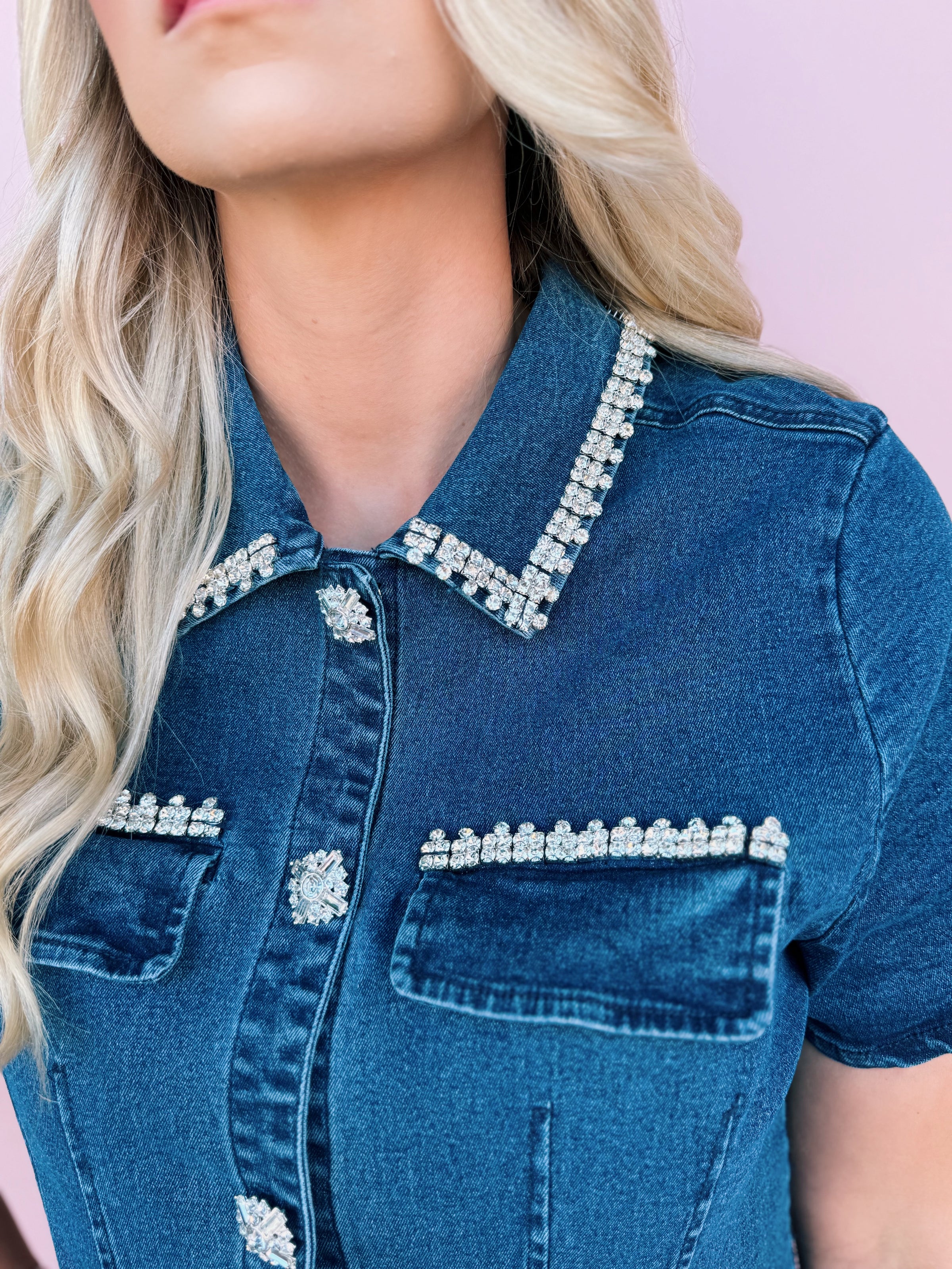 Saddle up in sparkle with our Rhinestone Trim Denim Dress! This western-chic mini features a flattering fitted silhouette, pearl-trimmed pockets, and dazzling rhinestone button details that make it stand out from every angle. With a collared neckline and soft stretch denim, it’s the perfect mix of casual comfort and glam.