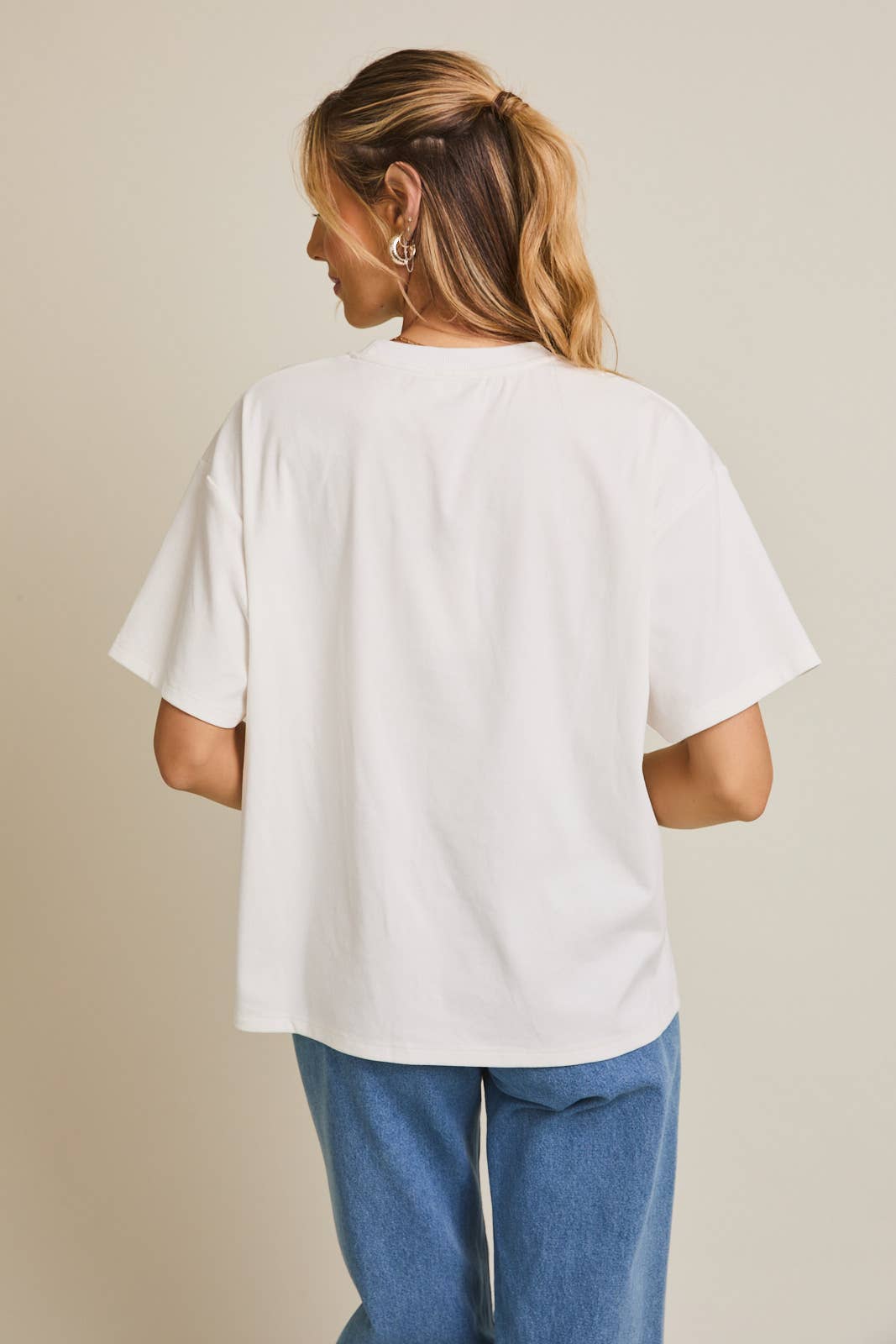 Sweet, simple, and a little nostalgic — the Honey Bear Graphic Tee brings cozy charm to your casual days. Crafted from soft cotton with a relaxed fit, it features an adorable embroidered teddy bear wearing a hat and bow for that vintage-inspired touch. Perfect for pairing with denim or layering under a cardigan for a cute, effortless look.