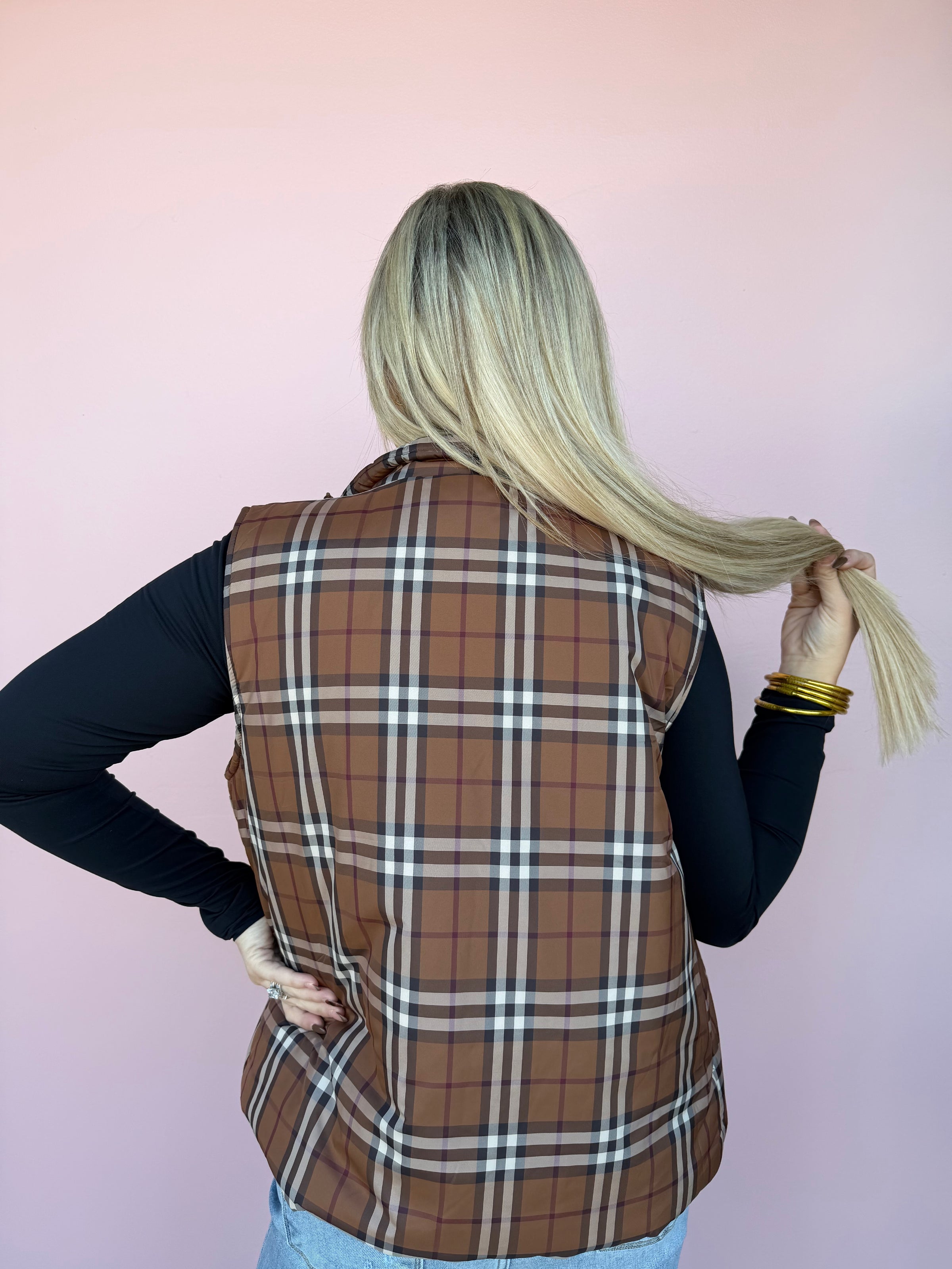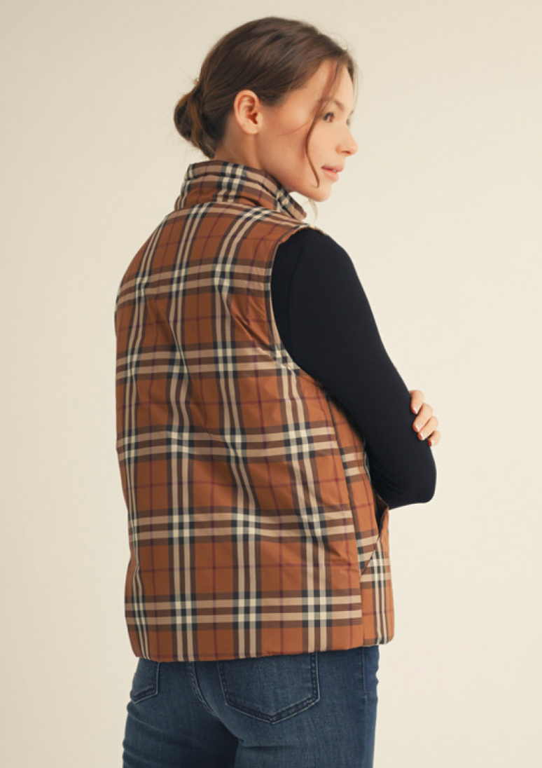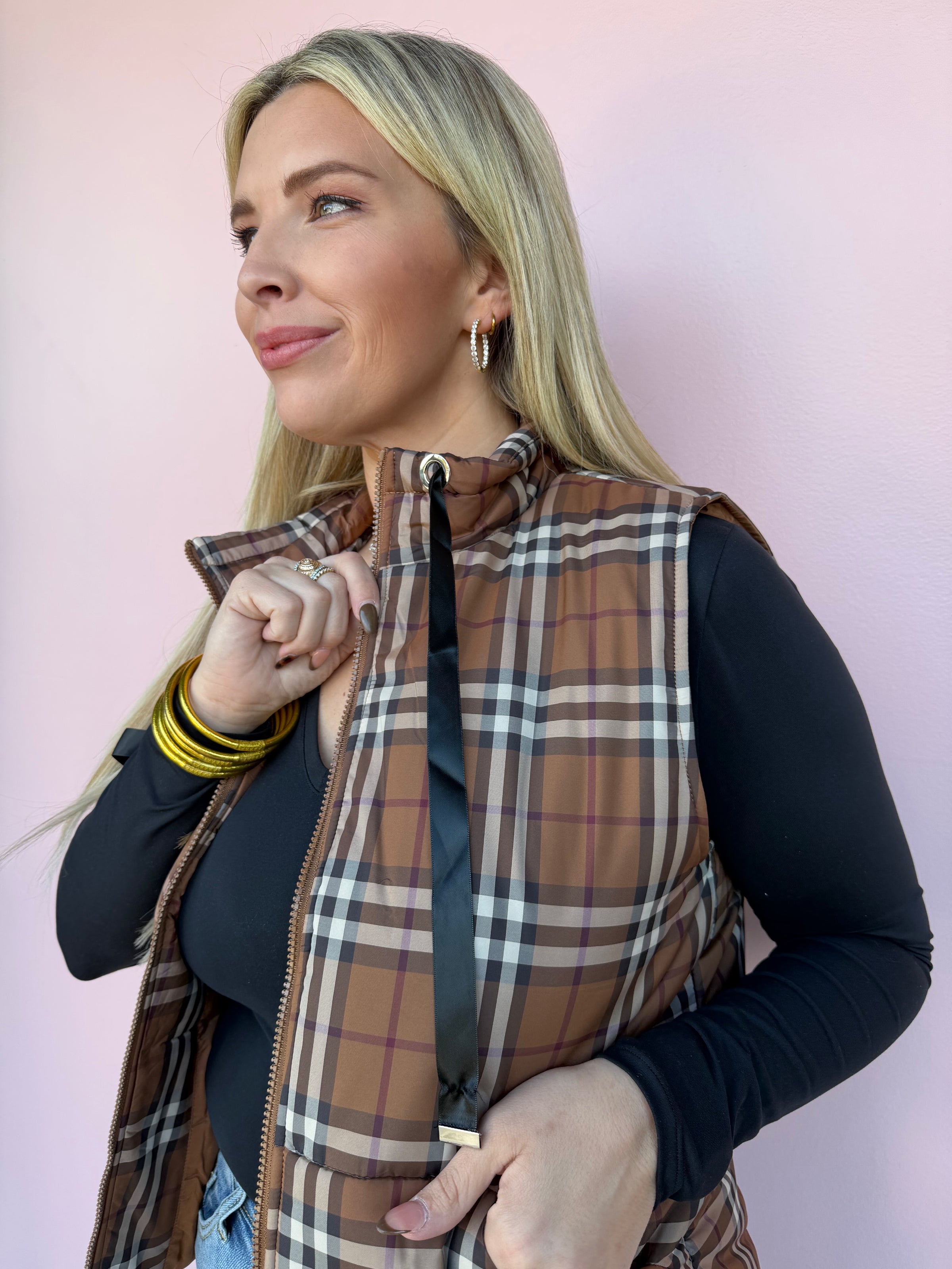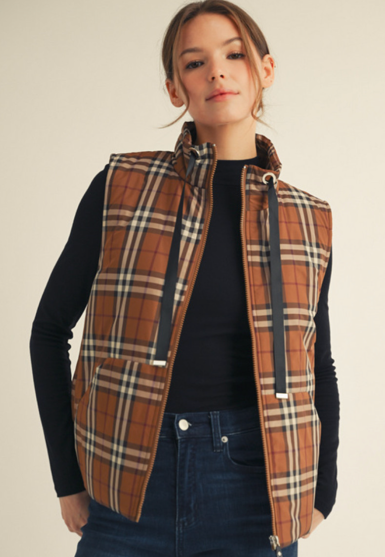 Layer up in effortless style with the Autumn Trails Plaid Puffer Vest! Featuring a rich caramel plaid print, full zip front, and sleek black drawstring details, this lightweight puffer vest is the perfect blend of cozy and chic. Designed for versatility, it’s ideal for fall layering over sweaters, turtlenecks, or long sleeves while adding a polished pop of print to your outfit.