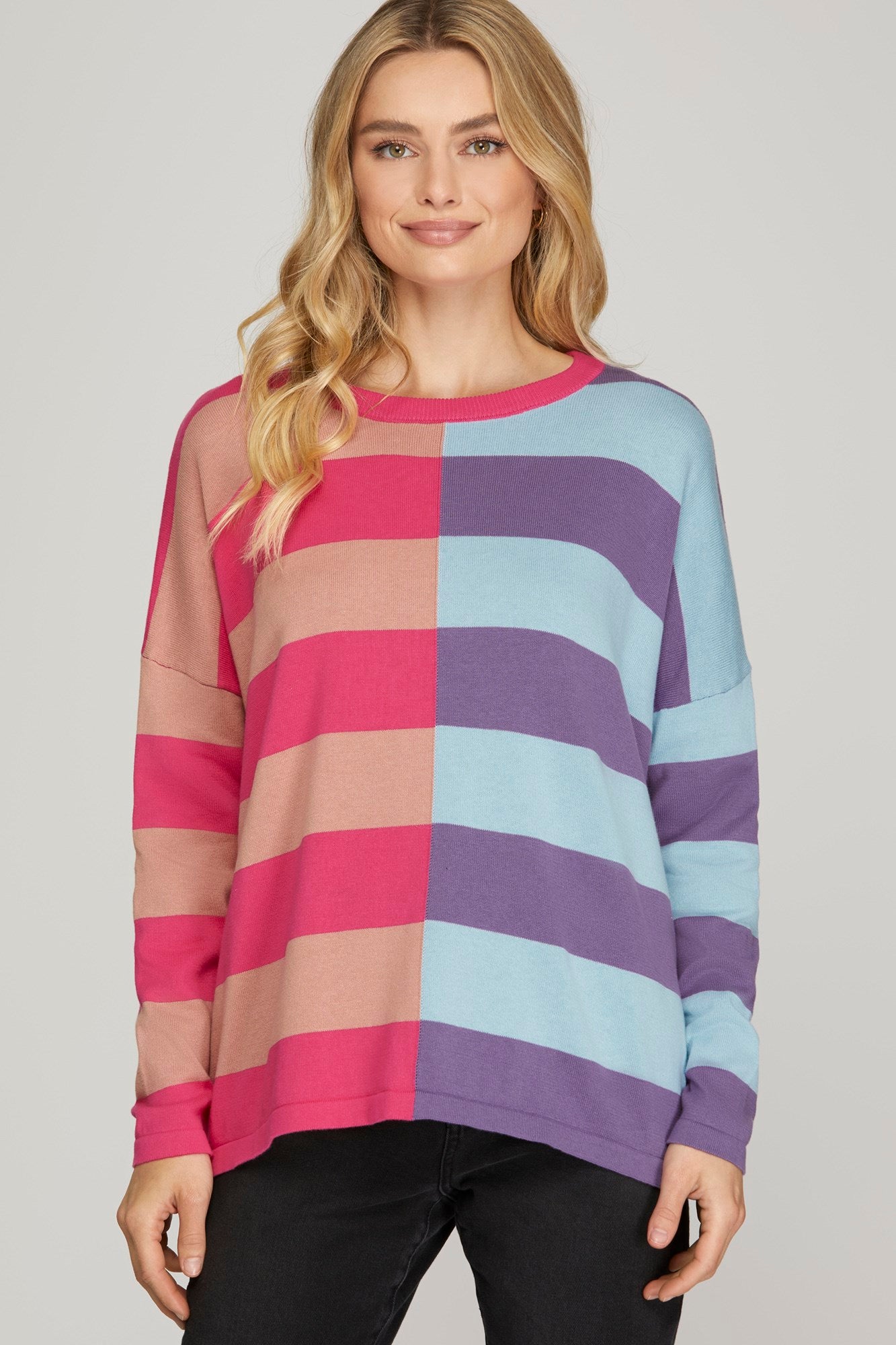 Bring the color and confidence with the Bright Intentions Sweater! Featuring bold, cheerful stripes in shades of pink, lilac, tan, and sky blue, this soft knit is all about making cozy feel cute. The relaxed fit and drop-shoulder design keep it comfy for everyday wear while the vibrant palette adds a fun, uplifting touch to your winter lineup.