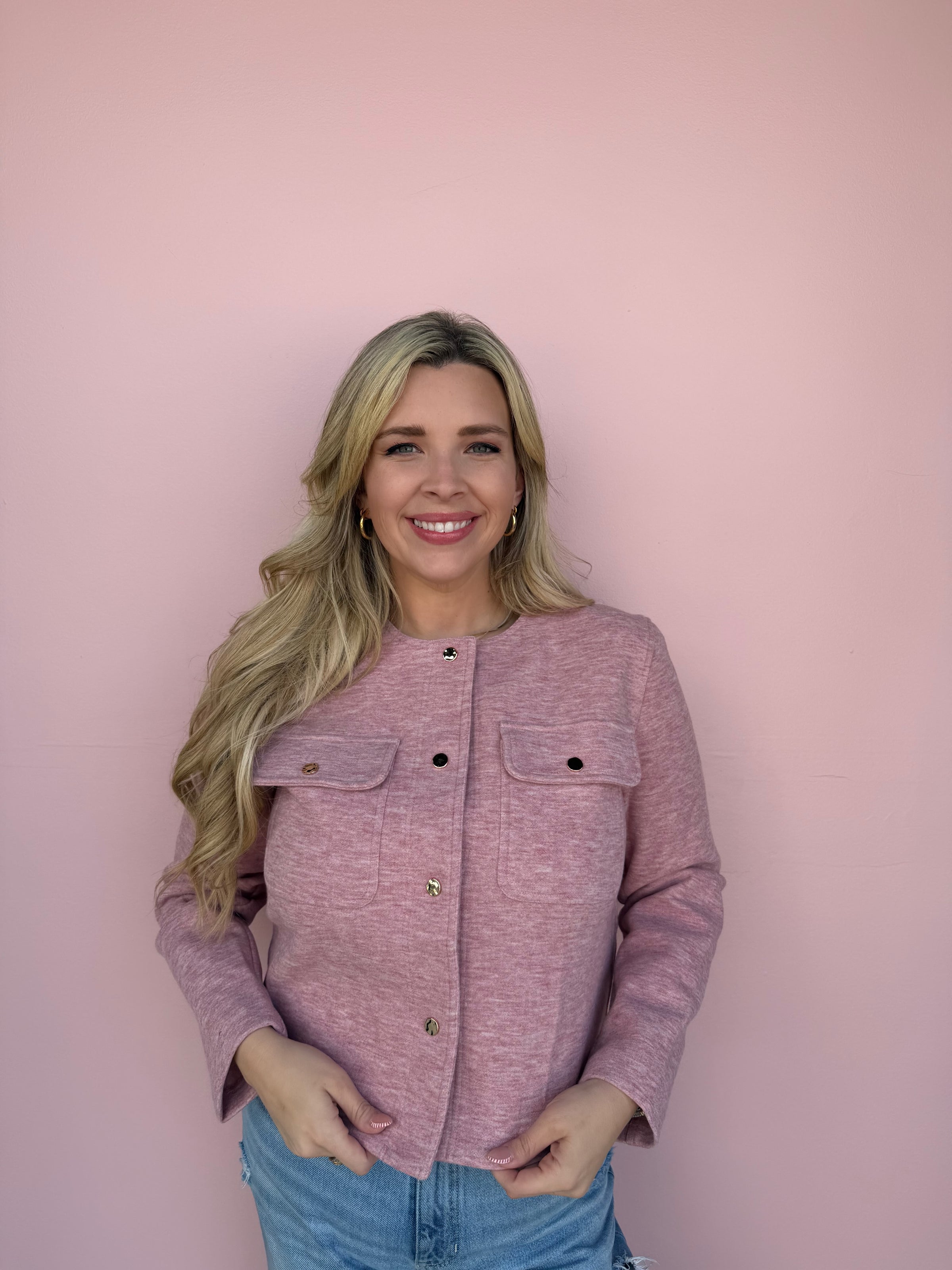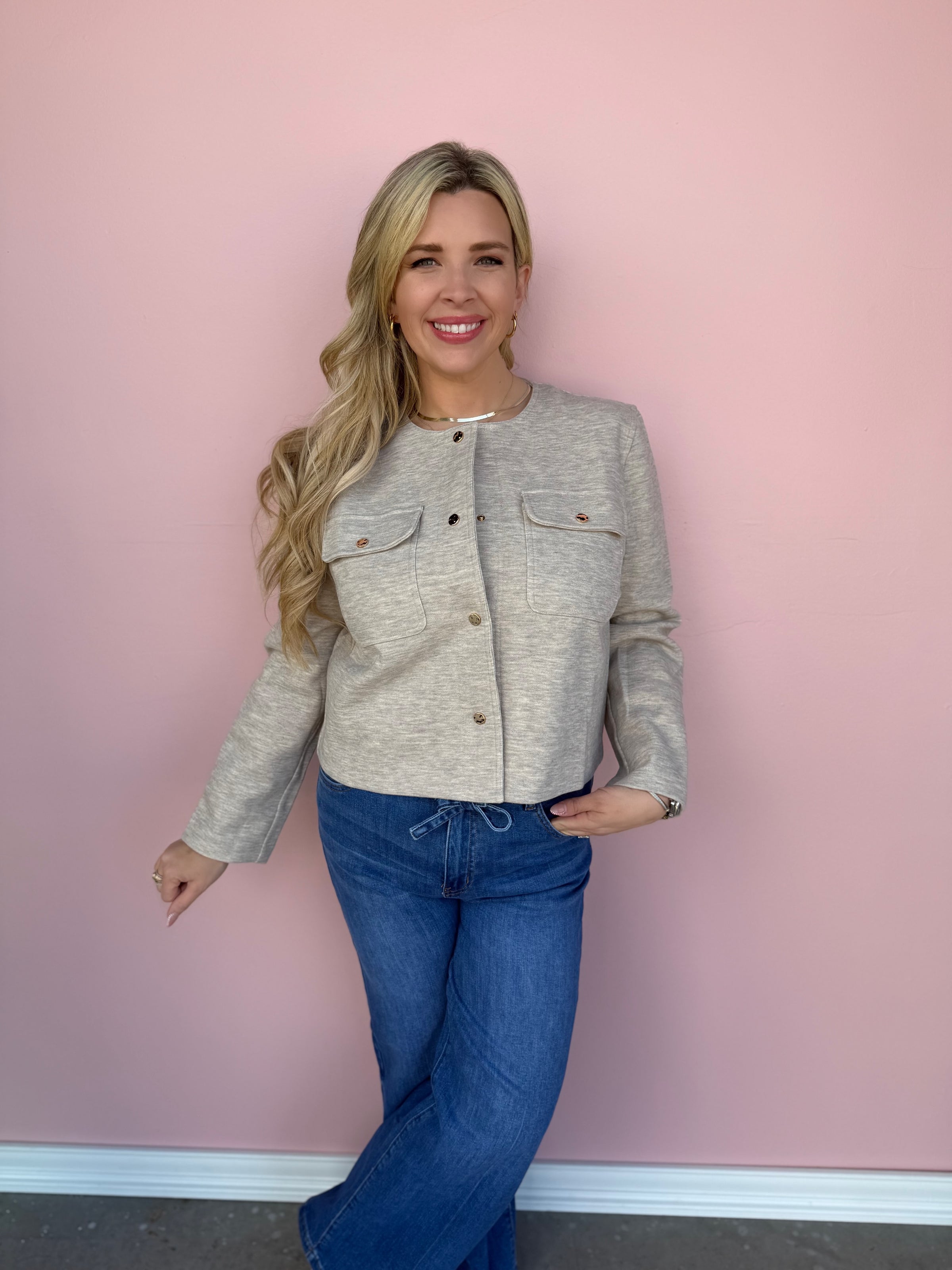 Meet The Goldie Snap Jacket — your new go-to lightweight layering jacket for every season. Available in oatmeal beige and soft pink, this chic piece features polished gold snap buttons, utility-inspired front pockets, and a flattering, slightly boxy fit. Perfect as a casual everyday jacket, it easily layers over tanks, tees, or sweaters without feeling bulky. Designed for women of all shapes, this versatile style comes in sizes S–3XL, making it a must-have transitional outerwear option for spring, fall, or cool summer nights.