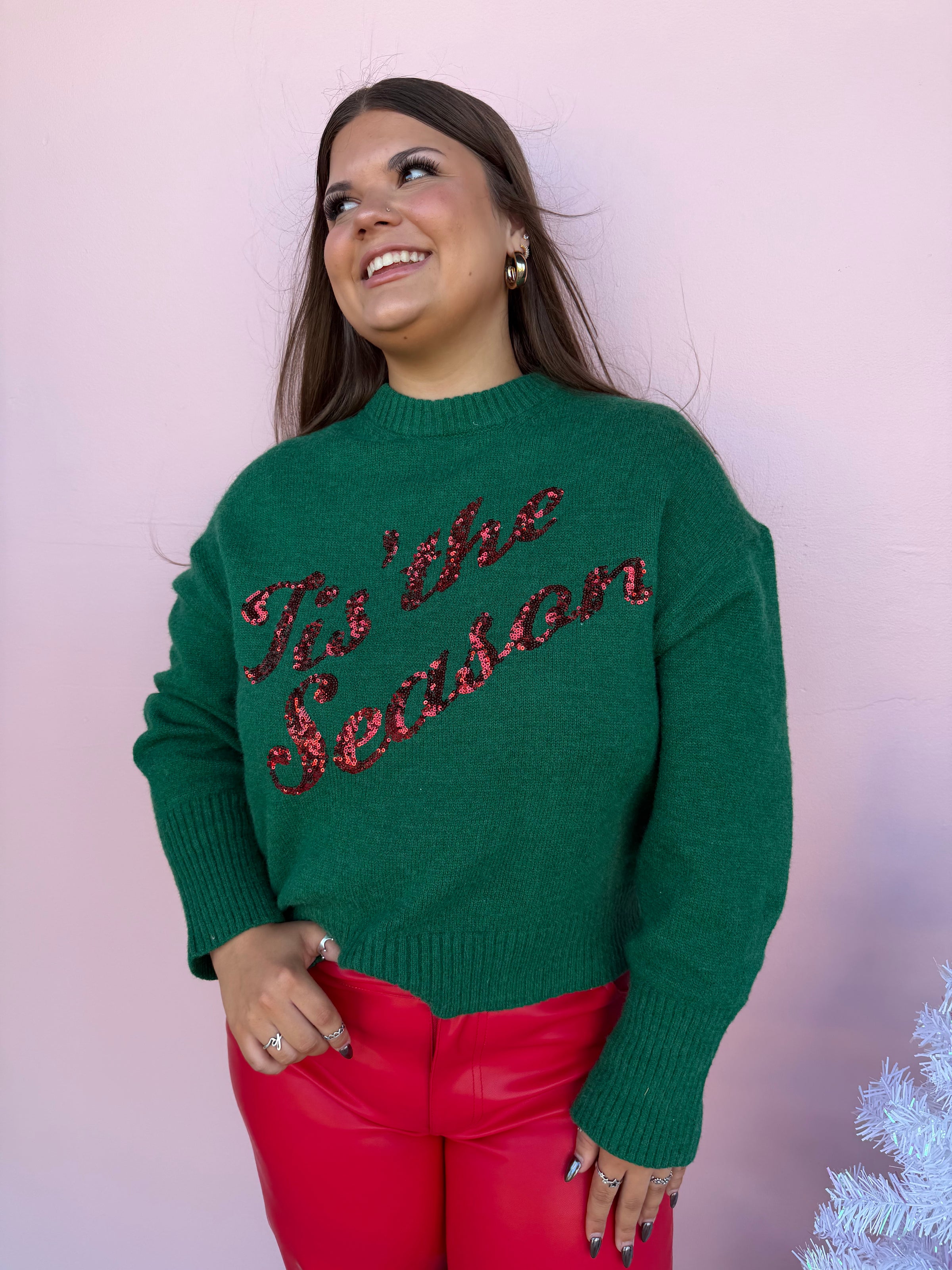 Sparkle all holiday long in the ‘Tis the Season Sequin Sweater! This cozy forest green knit features bold red sequin lettering that brings instant festive cheer to your winter wardrobe. With its relaxed fit and soft, warm feel, it’s perfect for holiday parties, cozy nights in, or festive family photos.