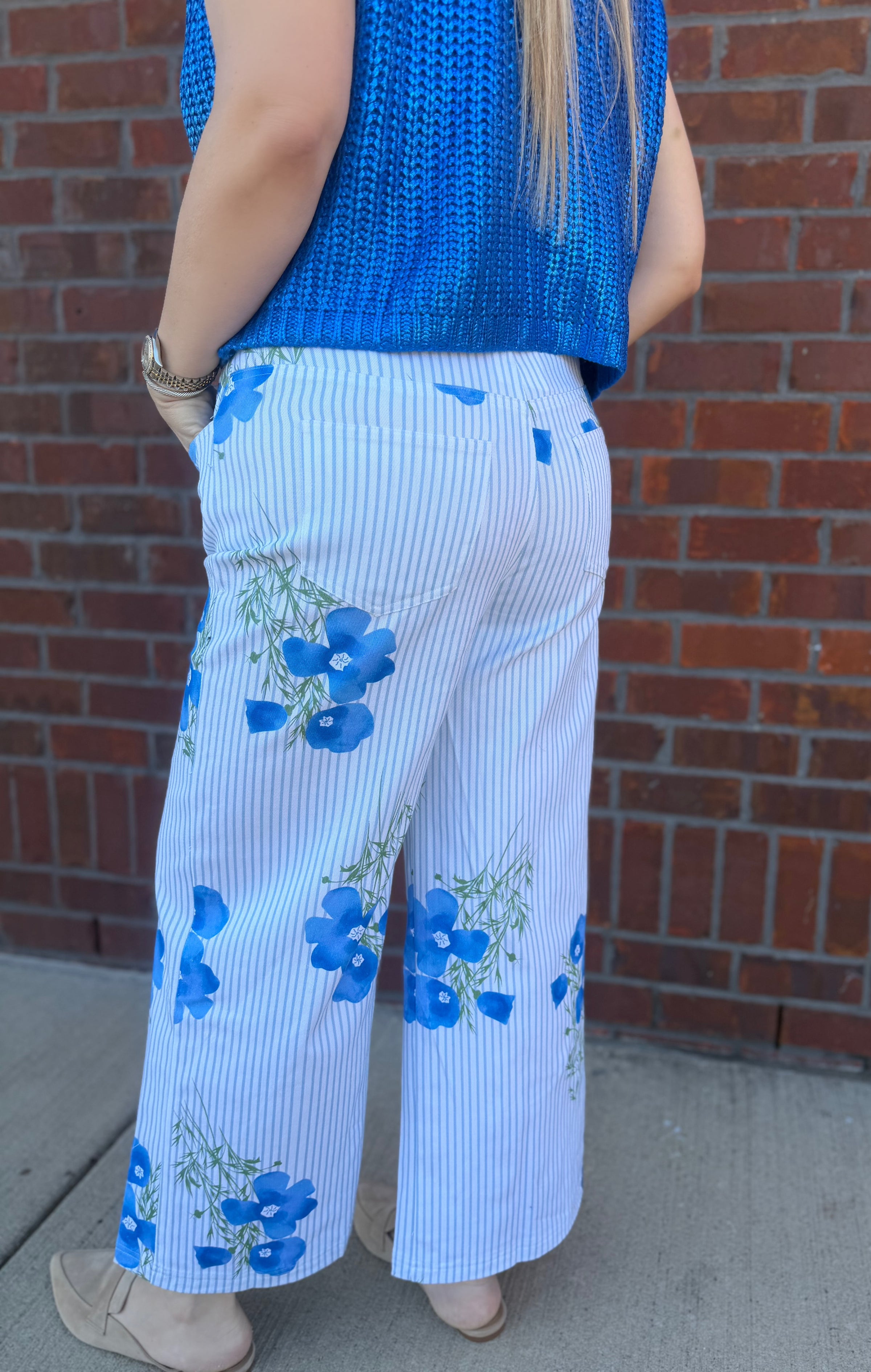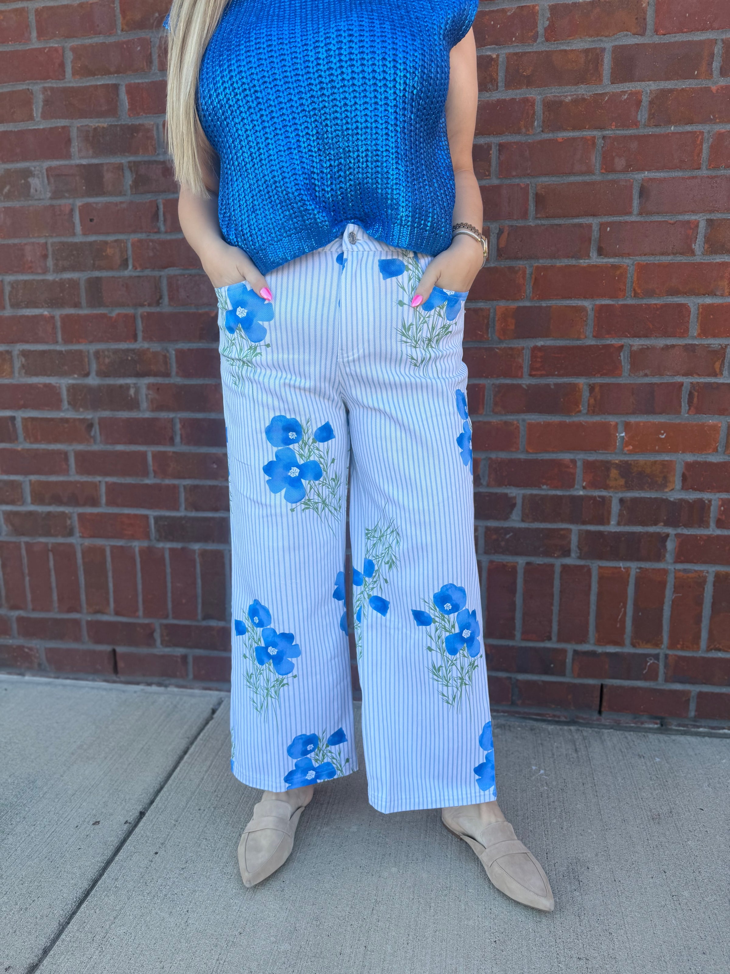 Fresh, feminine, and made to stand out, the Bluebell Stroll Wide Leg Pants bring an easy statement to your everyday wardrobe. Designed with soft blue pinstripes and oversized floral detailing, these pants blend classic charm with a playful boutique feel. The wide leg silhouette creates a flattering, elongating fit while keeping things comfortable and breezy for warm days ahead. Perfect paired with a simple knit or tucked blouse for brunch, spring events, or an elevated casual look that still feels fun and effortless.