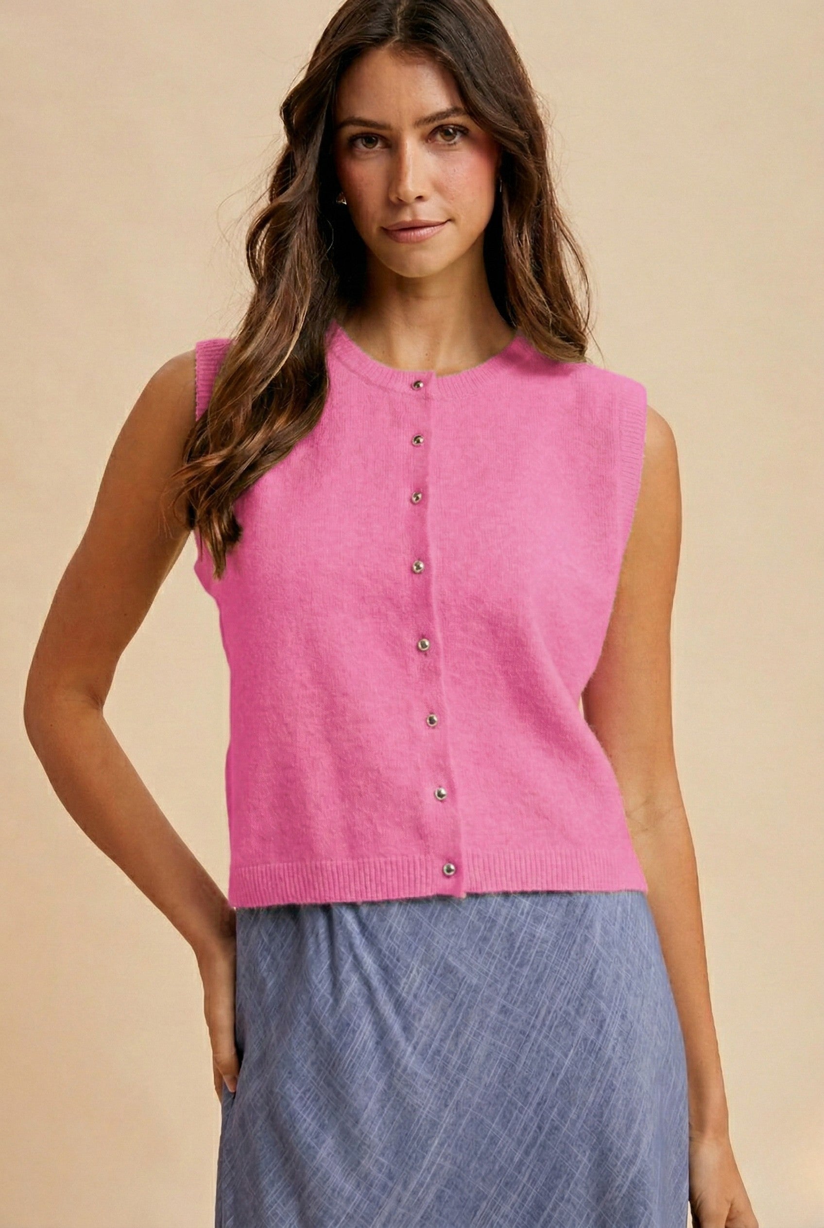The structured yet cozy knit gives shape without bulk, making it perfect worn alone or layered over a crisp blouse. The polished button detail adds just enough shine to elevate your everyday look.