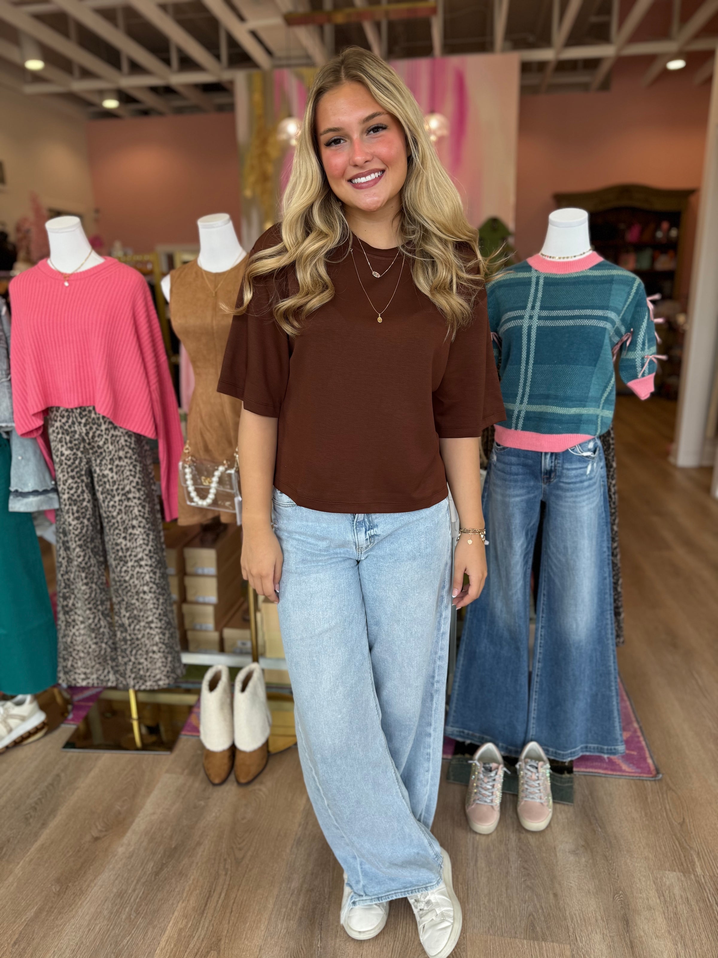 Meet your new wardrobe essential: the Luxe Everyday Boxy Tee. Designed with a minimalist boxy silhouette, this short-sleeve crewneck top is the perfect blend of comfort and style. Available in blue slate and chestnut brown, it’s versatile enough to pair with jeans, leggings, or skirts for a laid-back yet polished look.