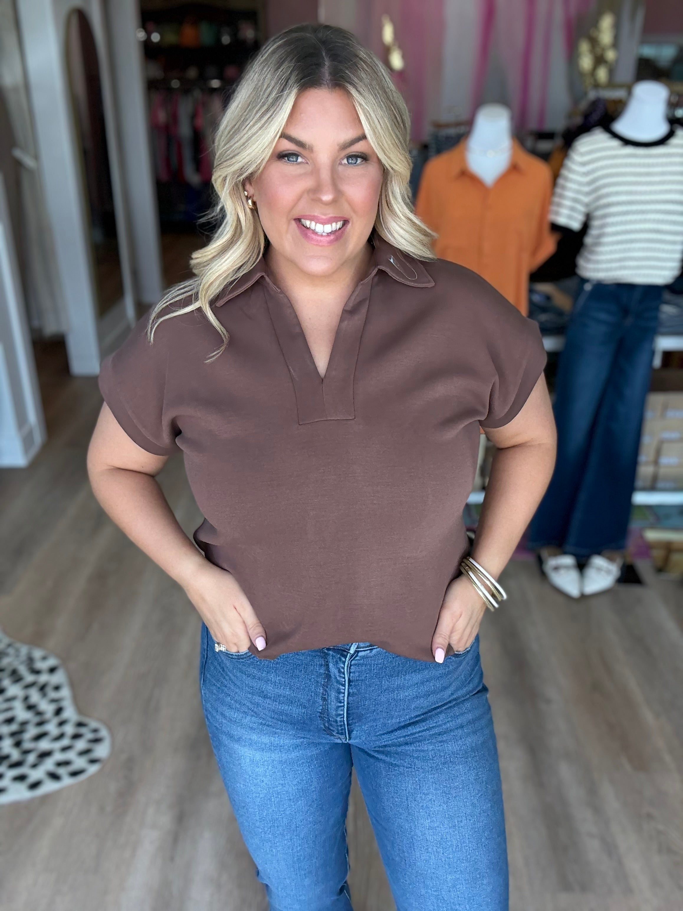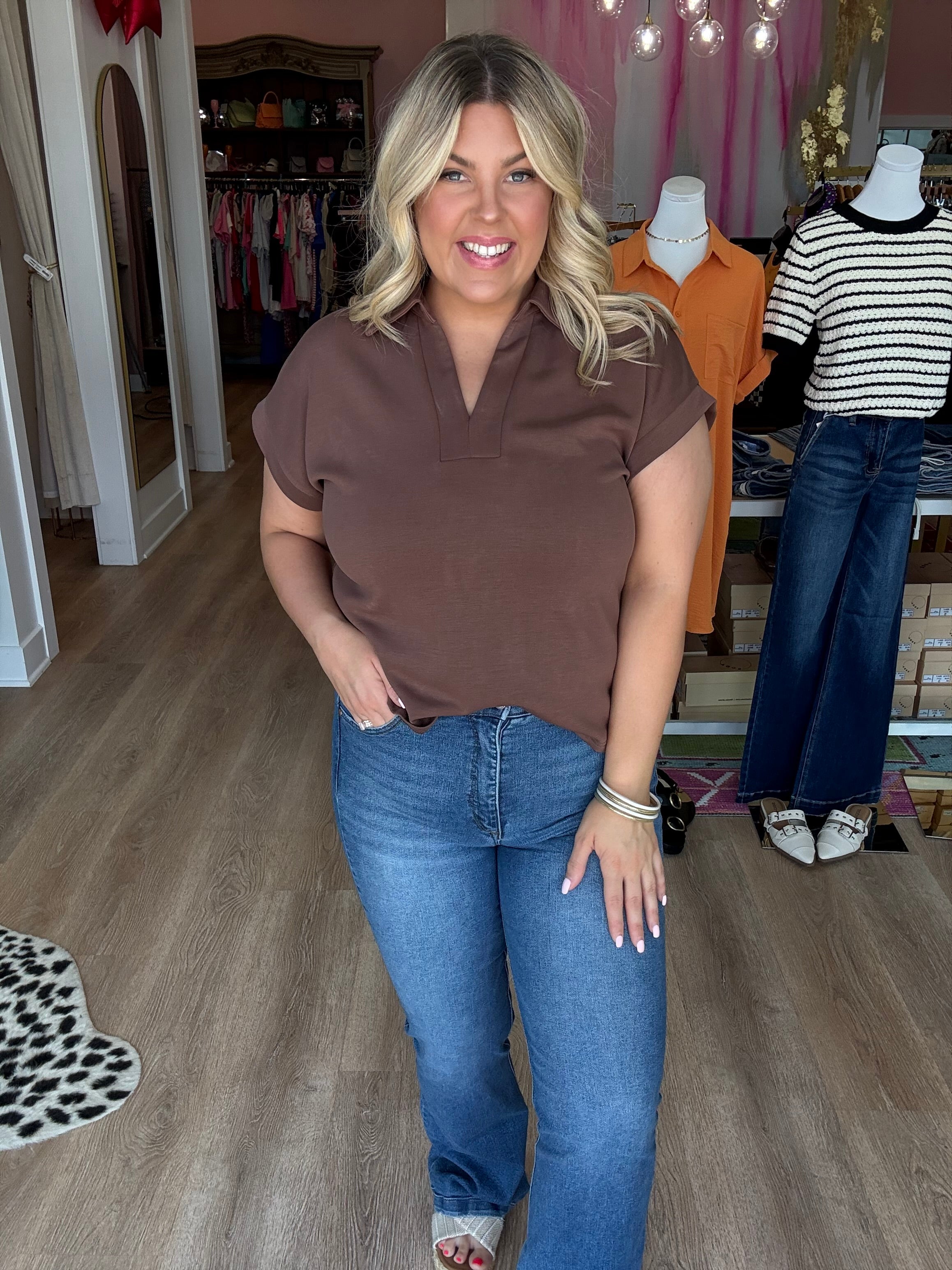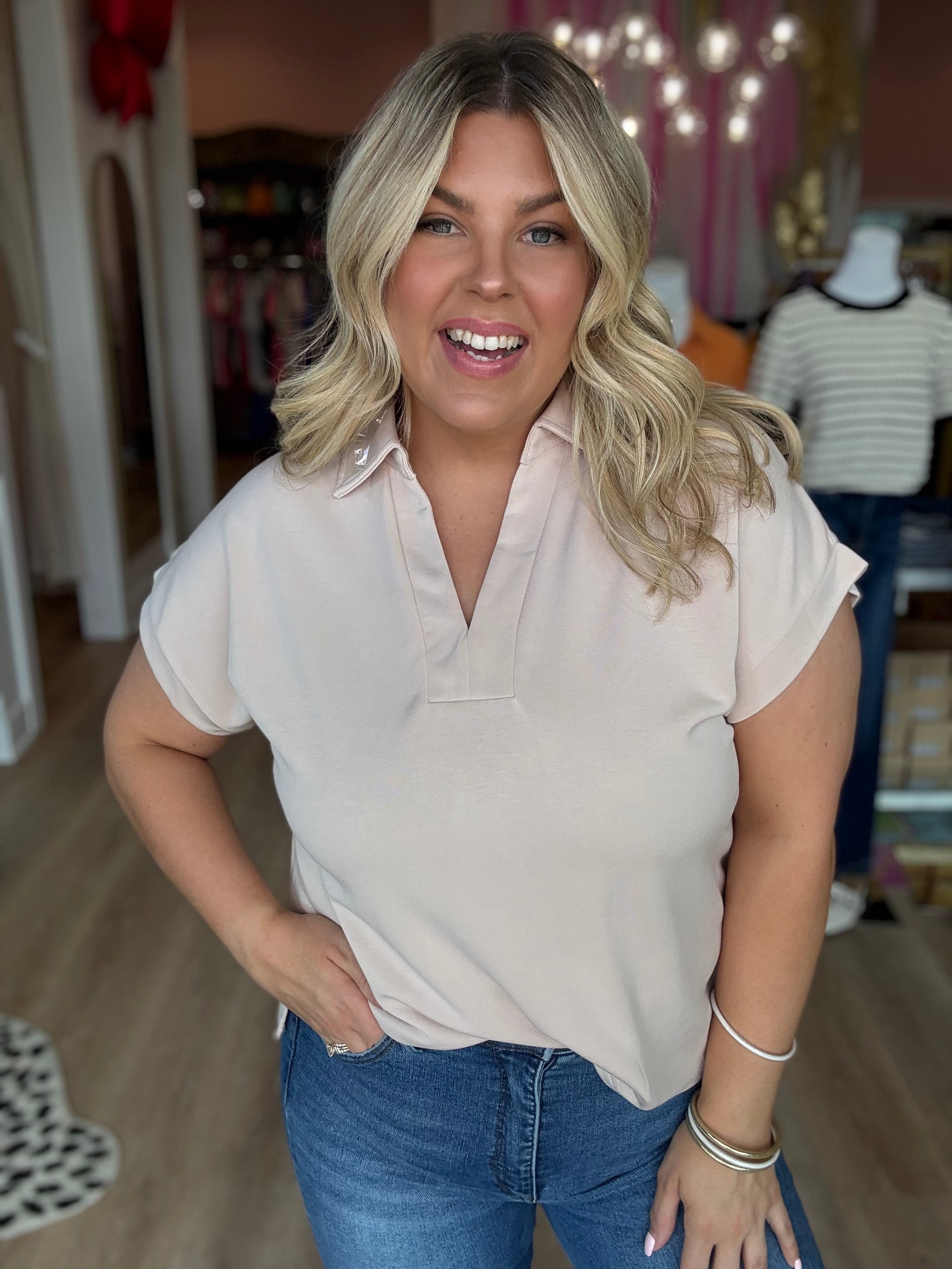 Your new everyday favorite is here — meet the Olive Luxe Soft Touch Top. Designed with an effortless oversized fit and made from the softest, dreamiest fabric, this top feels just as good as it looks. The relaxed collar and deep V neckline add a touch of polish, while the rolled sleeves keep it casual and cool. Pair it with denim, trousers, or leggings for a versatile look that goes from lounging to lunch dates in seconds.