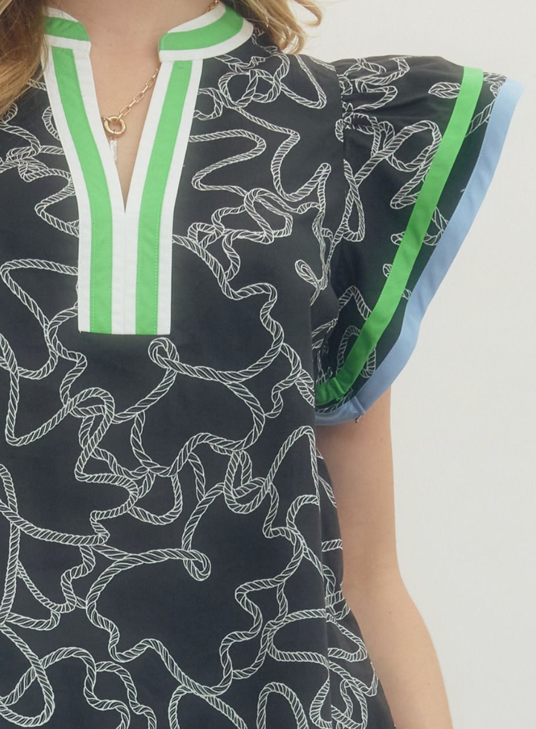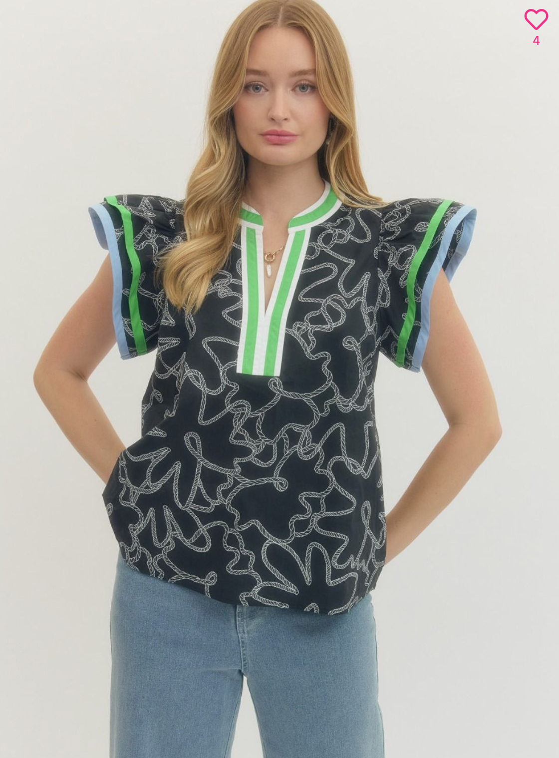 A little bold, a little polished, and made to stand out without trying too hard. The Coastal Current Flutter Top features a striking navy base with an abstract rope-inspired print, finished with eye-catching green and blue contrast trim along the neckline and flutter sleeves. The relaxed fit keeps it easy and flattering, while the structured neckline adds just enough polish to take you from casual lunch to dinner plans effortlessly. Pair it with denim, white jeans, or shorts for an elevated everyday look that still feels fun and fresh.
