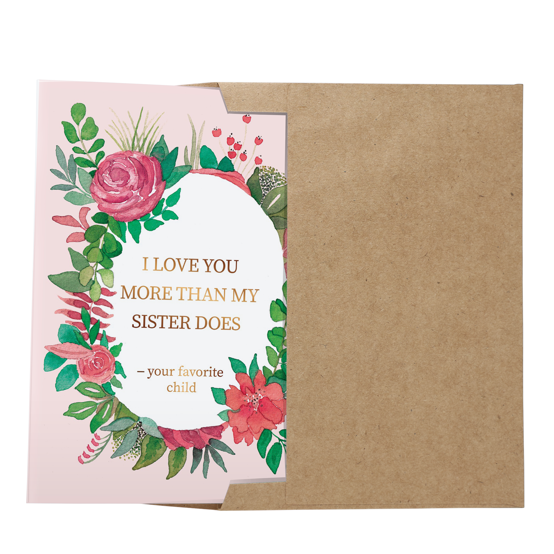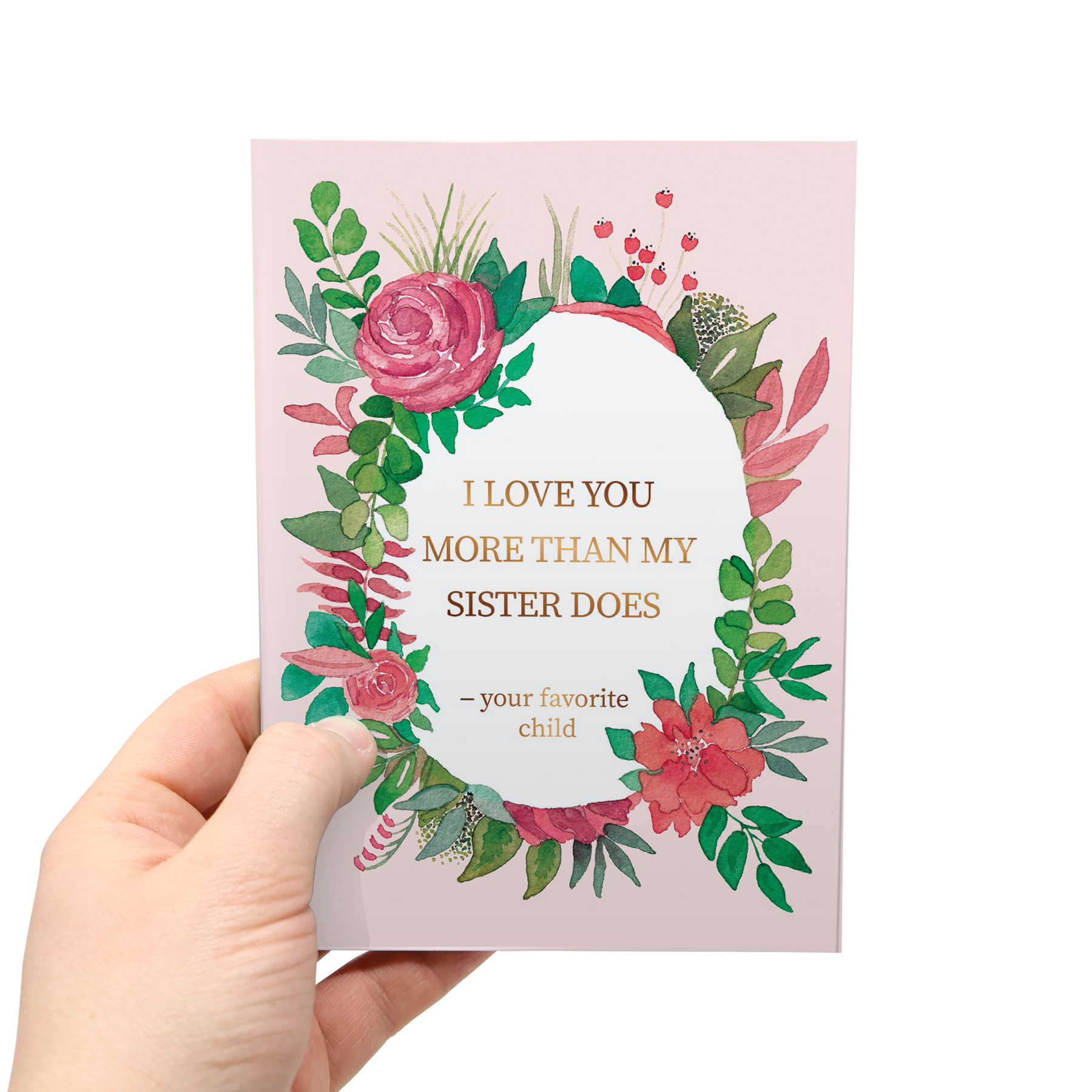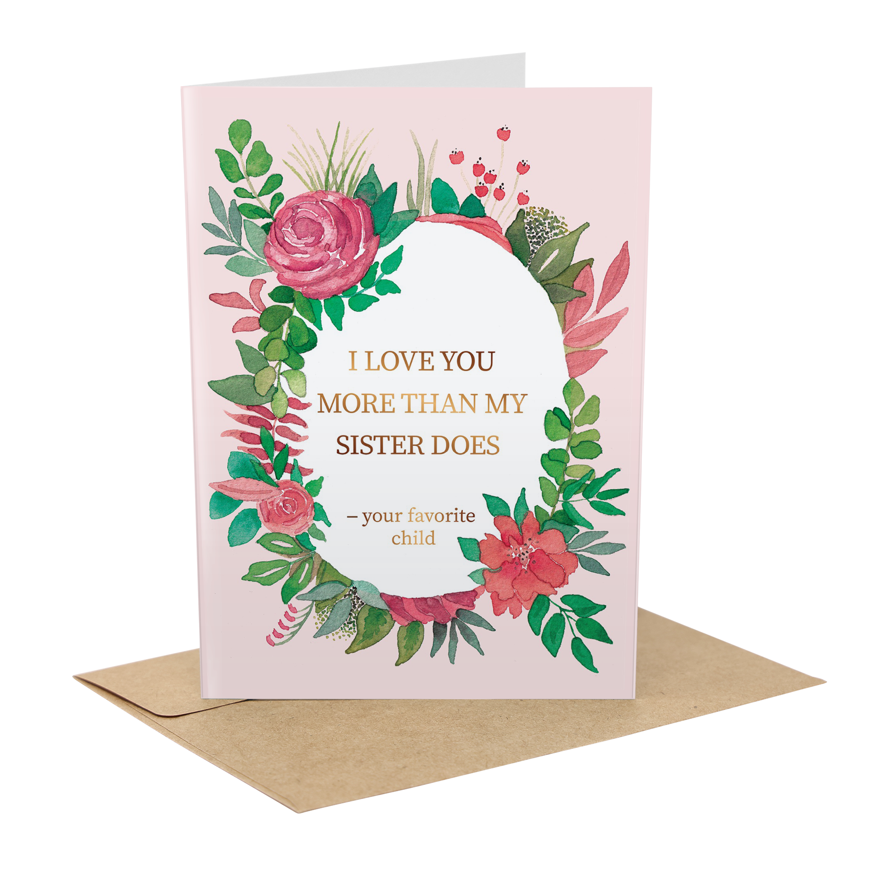 All favorite siblings unite! Introducing the perfect card to remind your mother who her favorite child is this Mother’s Day (you, of course!). And if you have yet to earn favorite child status, this card will surely put you in the lead! Featuring a floral wreath surrounding beautiful golden lettering against a pink backdrop, you’ll want this card to last forever. Thankfully this sturdy card is made from high-quality recycled card stock and layered with a matte finish to provide your mom with a long-lasting reminder of how awesome you are!
