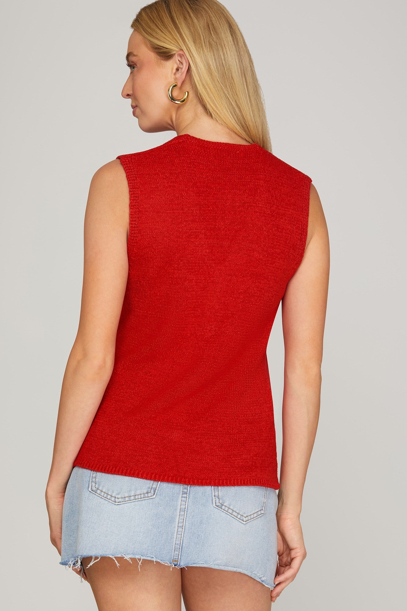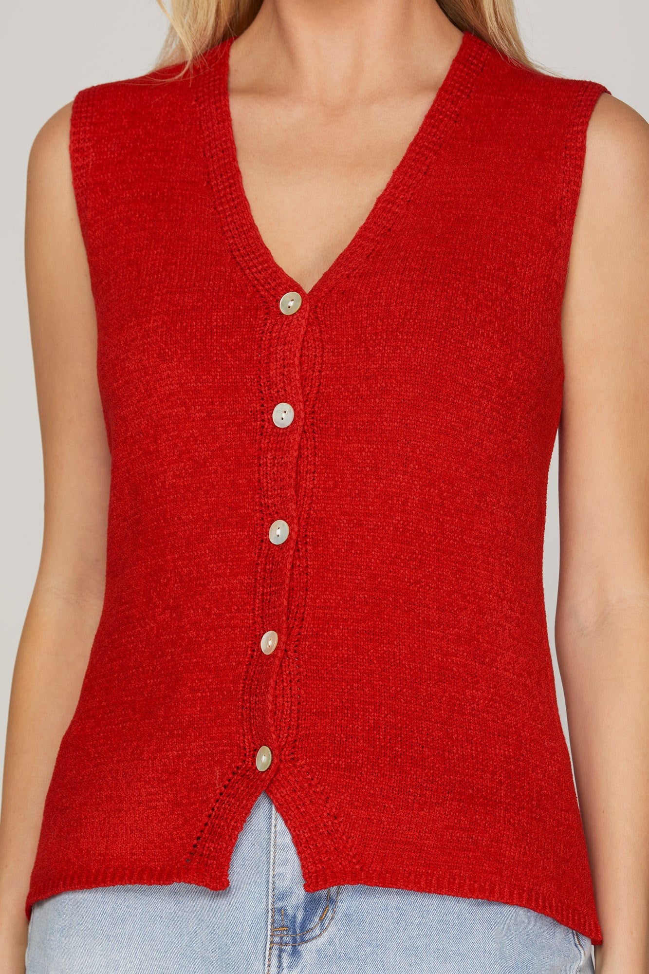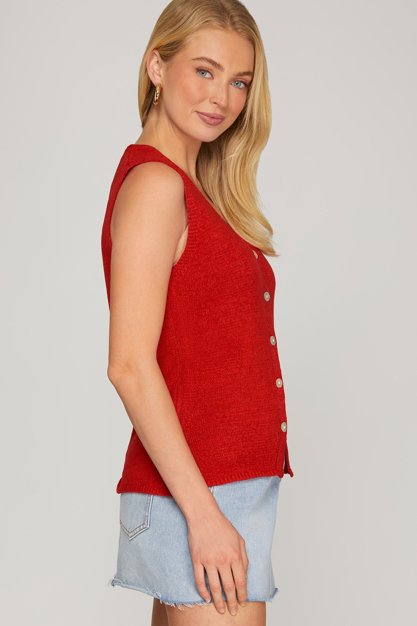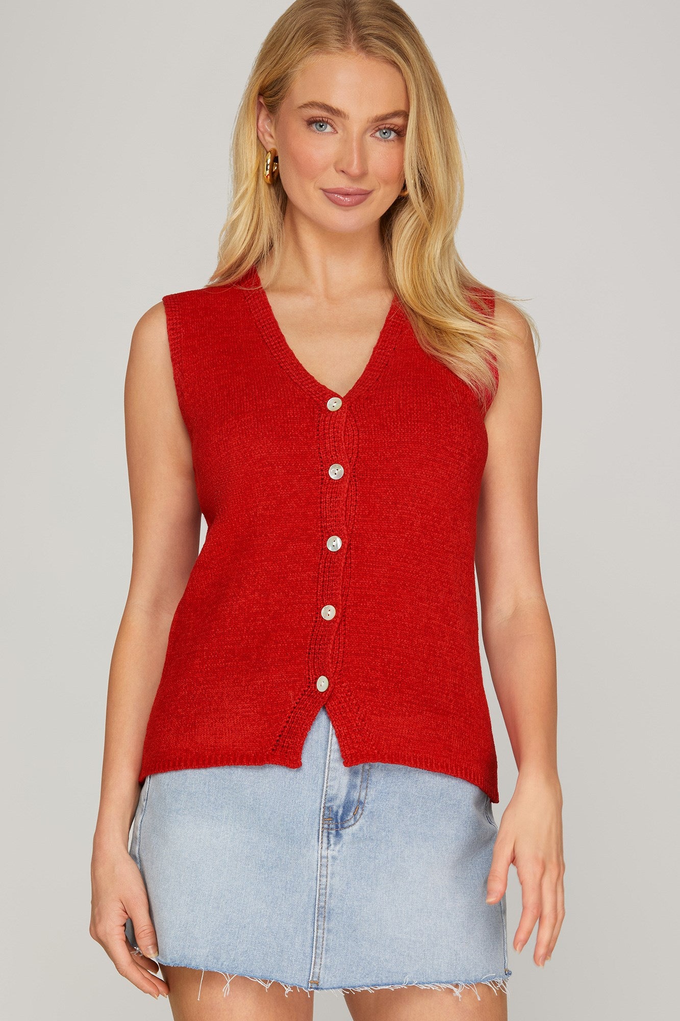 Bold, timeless, and effortlessly chic. The Scarlet Button-Front Knit Tank features a rich red knit with a flattering V-neckline and functional button front for easy styling. The sleeveless silhouette makes it perfect for warm days, while the soft knit texture adds just enough polish to take it from casual to elevated. Pair it with denim shorts, jeans, or a skirt for an easy everyday look that still turns heads.