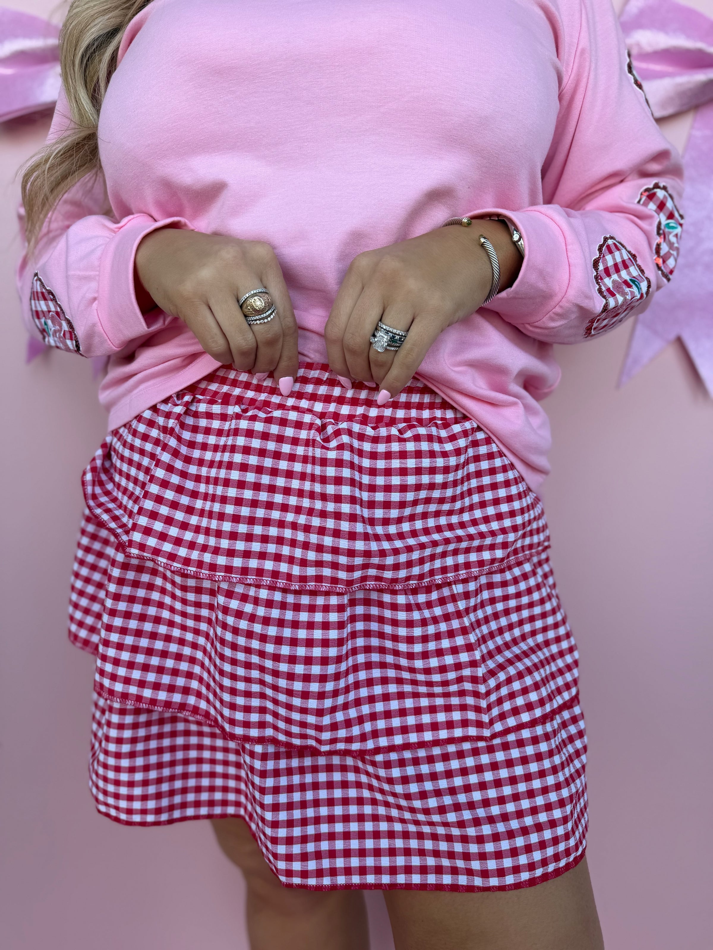 Playful and sweet, our Red Gingham Ruffle Skort is a must-have for your warm-weather wardrobe. Designed with a classic red and white gingham print, this flirty skirt features a tiered silhouette with a comfortable elastic waistband for the perfect fit. The lightweight fabric gives it an easy, flowy feel—perfect for picnics, date days, or sunny outings. Pair it with a simple tank, graphic tee, or puff-sleeve blouse for a fun and feminine look that never goes out of style.