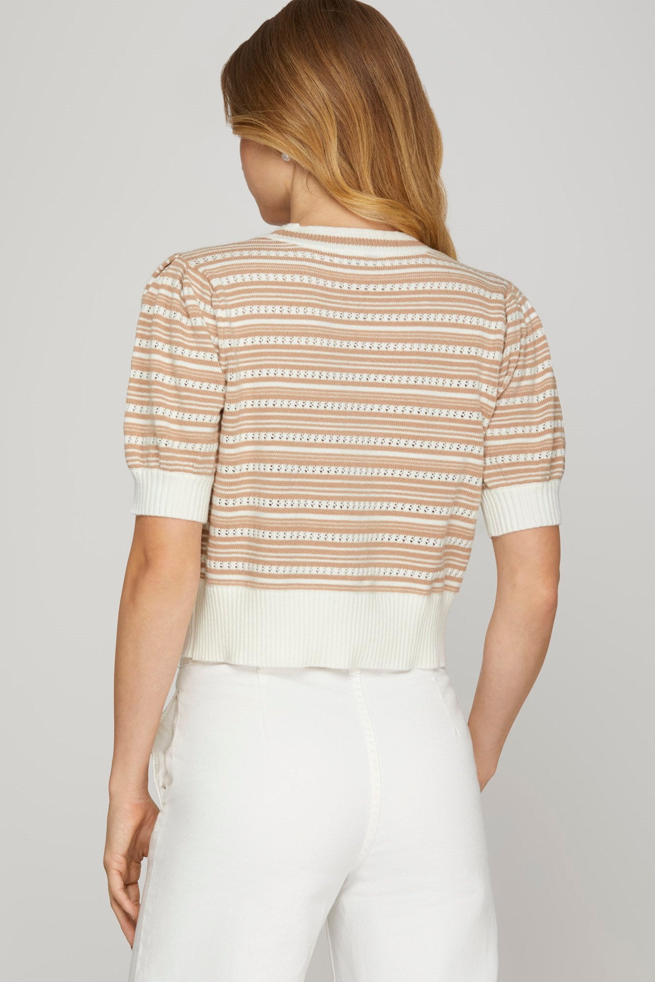 Sweet meets sophisticated in the Caramel Charm Bow Cardigan! Featuring dainty knit stripes in warm caramel and cream tones, this cropped short-sleeve cardigan adds instant polish to any outfit. The double bow detail along the front creates a feminine statement while keeping things playful and chic. Lightweight and breathable, itβs perfect for brunch dates, office days, or dressing up your favorite denim.