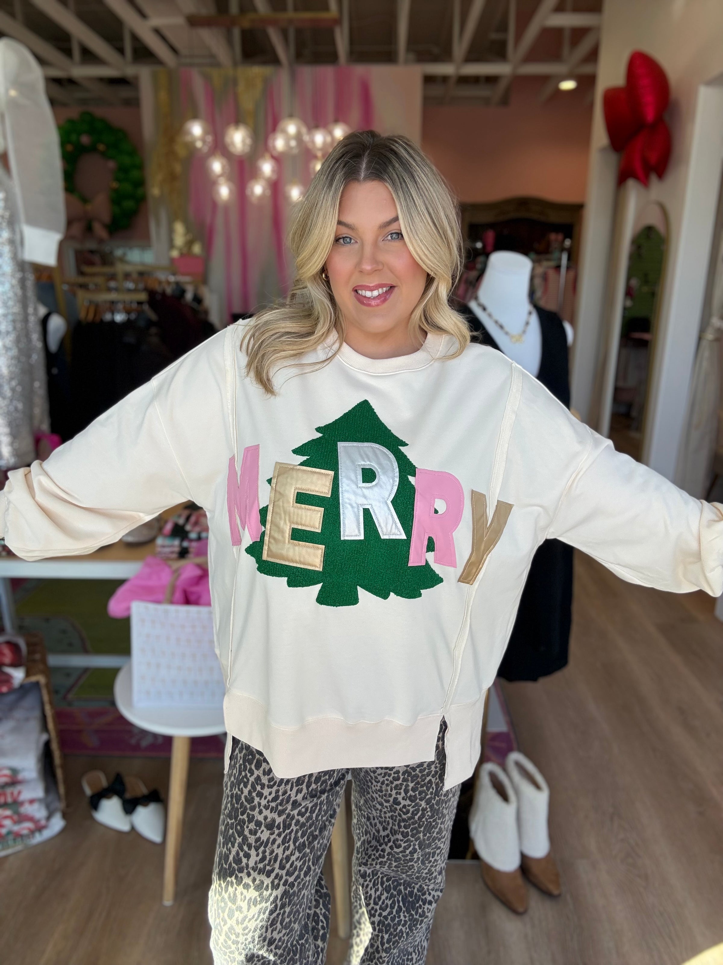 Spread holiday cheer in the Merry & Bright Metallic Patch Sweater! This super oversized ivory long sleeve sweater top is a cozy showstopper, featuring bold metallic faux leather “Merry” patches embroidered across the front. Soft, snuggly, and full of festive flair, it’s perfect for holiday parties, Christmas morning photos, or cozy cocoa dates.